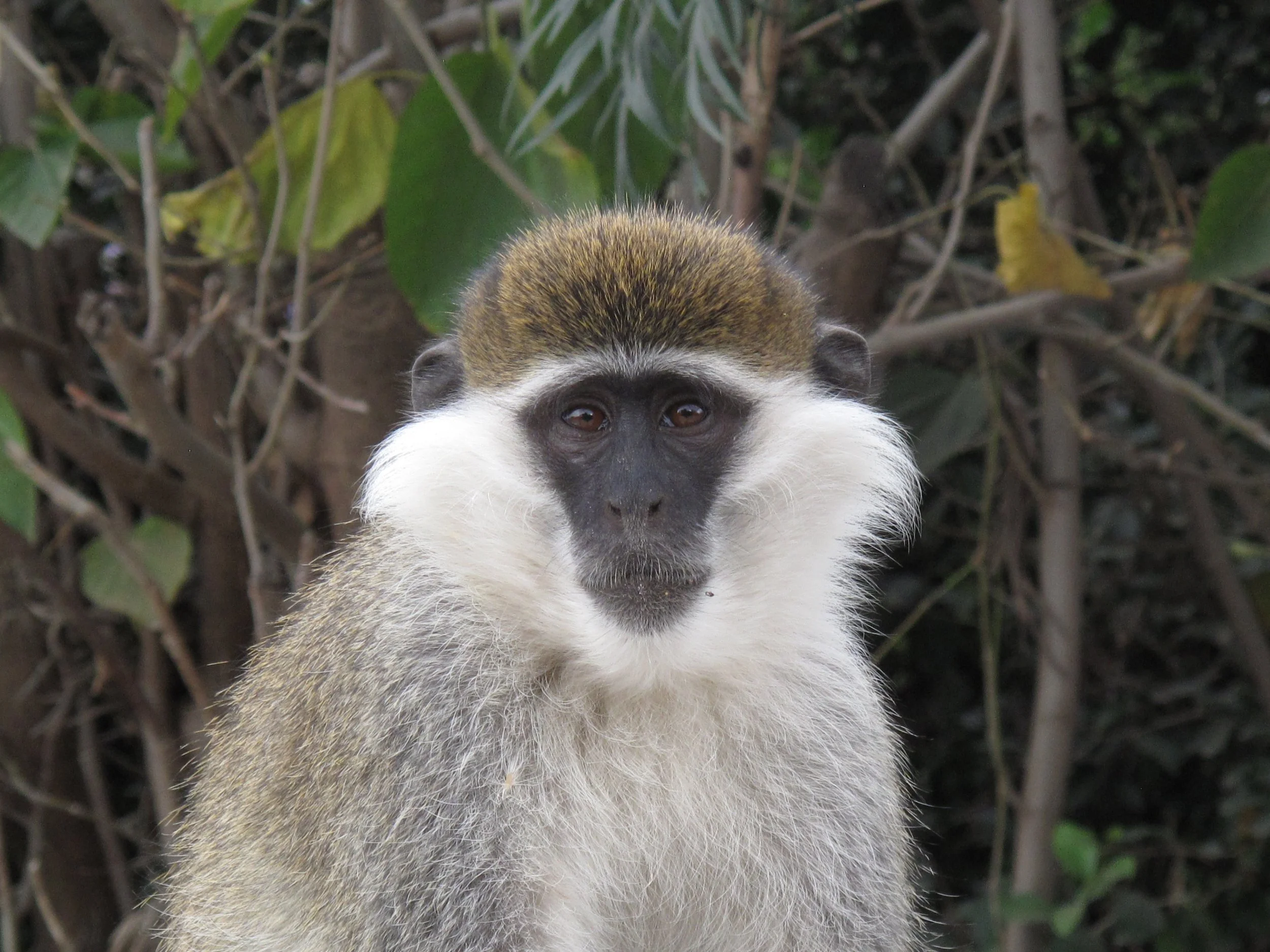 Stopping near a village, we came eye to eye with a grivet monkey. Grivets are Old World monkeys found in woodland and savanna areas of Africa’s East Rift Valley. The primates have long tuffs of white hair along the sides of their faces. Weighing between 3.4 and 8 kilograms, the monkeys are also distinguished by their olive-colored fur and may be seen walking on all fours or running on hind legs. Grivets live in troops of five to 70 individuals and eat vegetables, insects, and small birds. In some villages they supplement the local diet as a type of bushmeat.