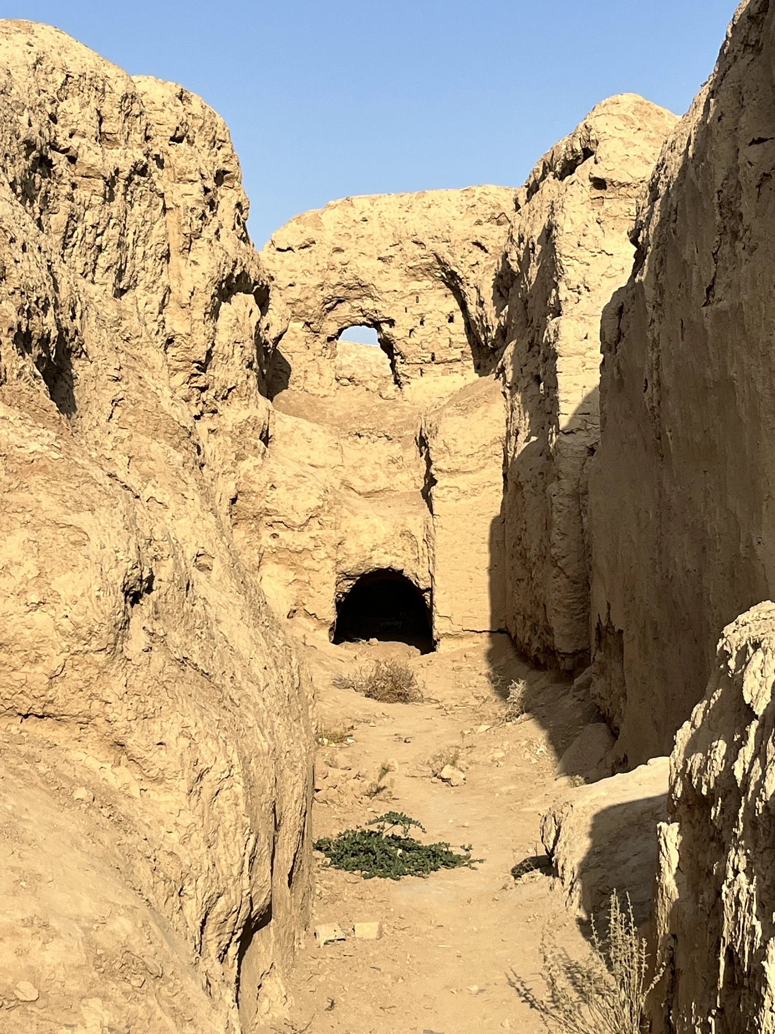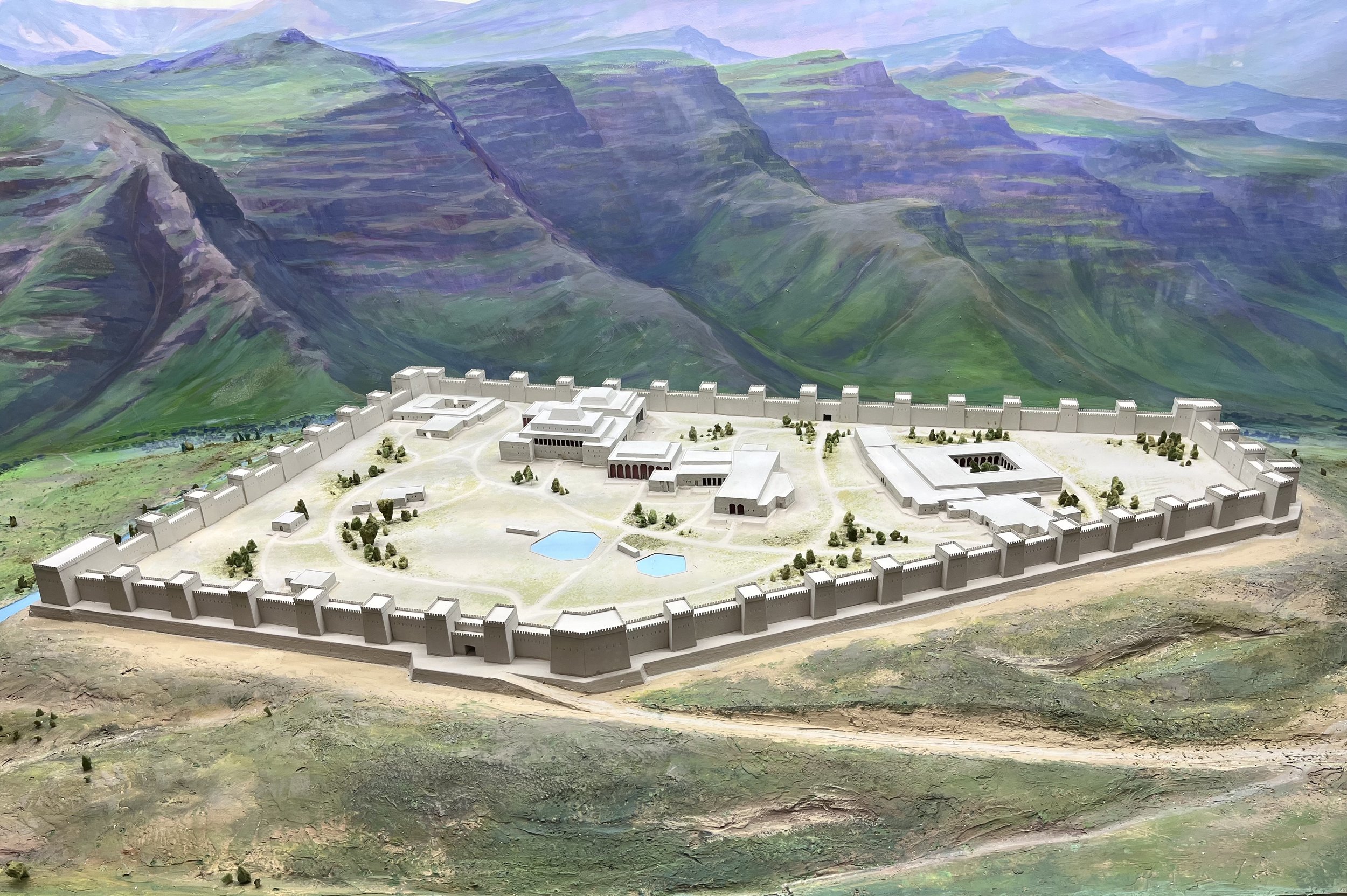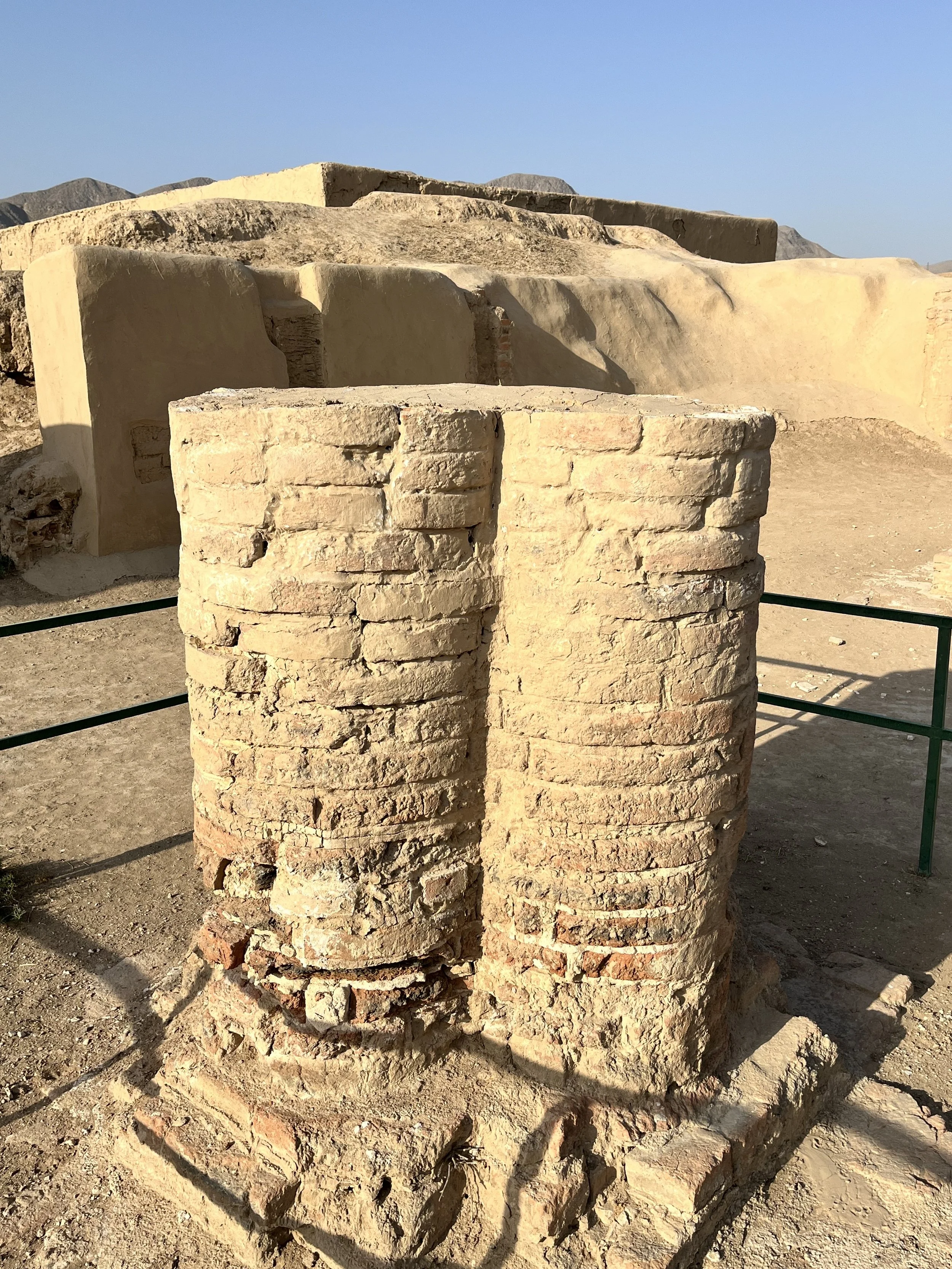 During its period of occupation, the city’s centerpiece was a 15-meter-tall citadel with towers at the northeast and southeast corners. Archeologists have uncovered colorful frescos depicting battle scenes painted on the building’s mudbrick walls and the remains of two Zoroastrian temples, a kitchen, and a courtyard house with a wine cellar. The Zoroastrian alter featured a sacred fire that would have been kept always burning. A columned atrium and round-shaped hall were positioned near the city’s southeast corner. A guide explained that bricks near the base of the atrium’s columns were original while yellow tinted bricks found above were added as part of a recent reconstruction effort.