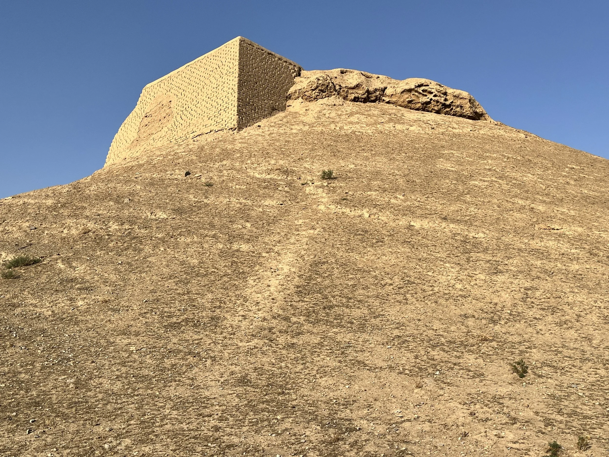 To reach Nisa we drove through Ashgabat’s Bagry neighborhood. Ancient Nisa has two parts that represent stages in the city’s development. Old Nisa served as an administrative and religious center while New Nisa grew as a gathering point for artisans and traders. Excavation of Old Nisa began in 1947. After parking, we took a stairwell leading to the top of an artificial hill that partly covers the ruins of Old Nisa.