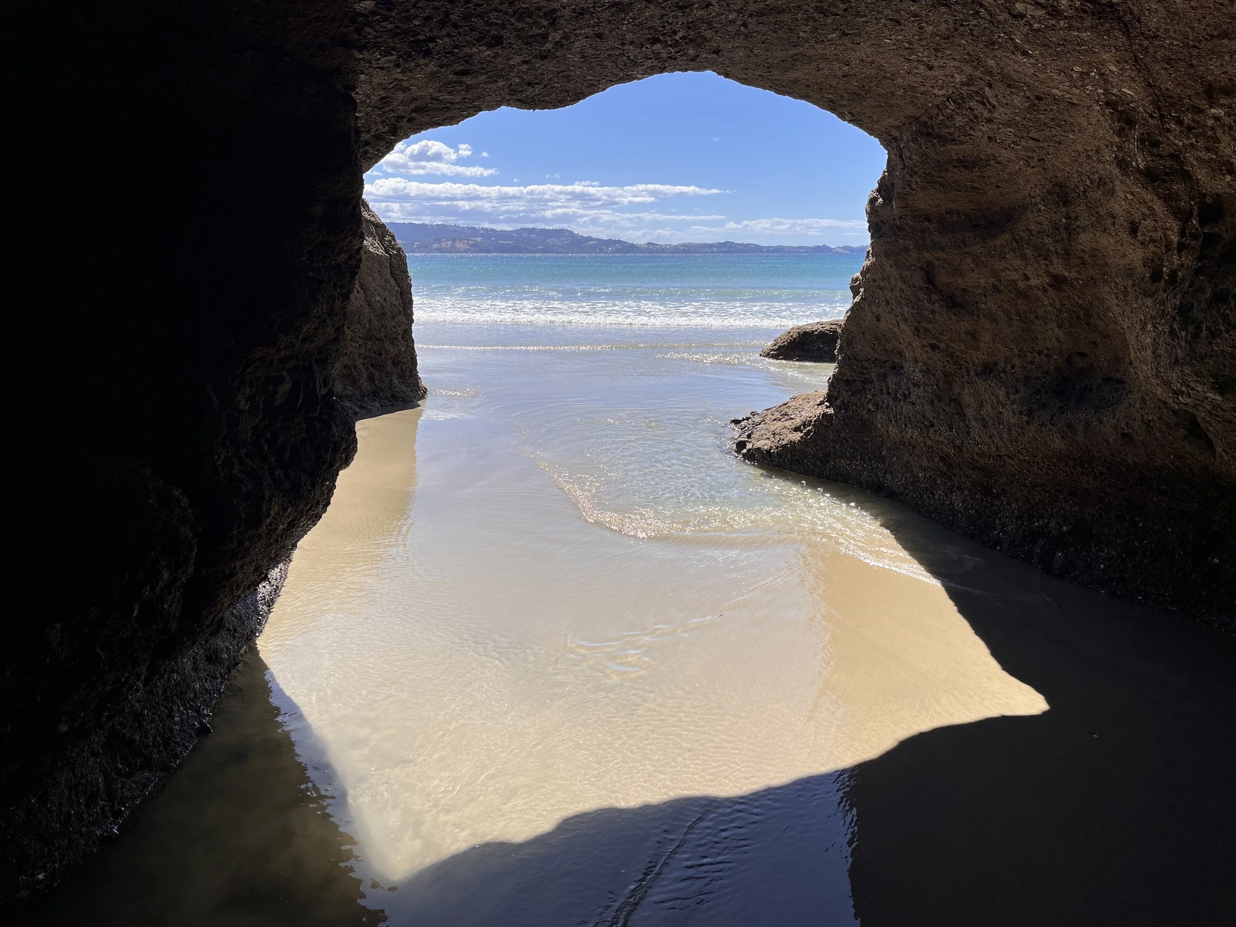 Driving southeast, we set out for Tawharanui Regional Park, located on the eastern side of the Tokato Peninsula. The park has white sandy beaches, wetlands, rolling pastures, and native coastal forest. Long ago the Māori built five pā (fortifications) within the present-day park. Archaeologists have also found middens (trash dumps), food storage pits, burial sites, and hillside terraces used for houses. Prior to its acquisition by the government, the 593-hectare park was a private farm operated by three families. Today the beach is surrounded by Pohutukawa trees. After reaching the beach we walked through a shallow coastal sea cave. During the 1990s, park officials transformed a portion of the area into a sanctuary for native birds with predator-proof fences to protect nesting areas. Birdlife includes korimako (aka bell birds), native robins, and dotterels. During early evening hours it may be possible to spot shy kiwis in the brush.