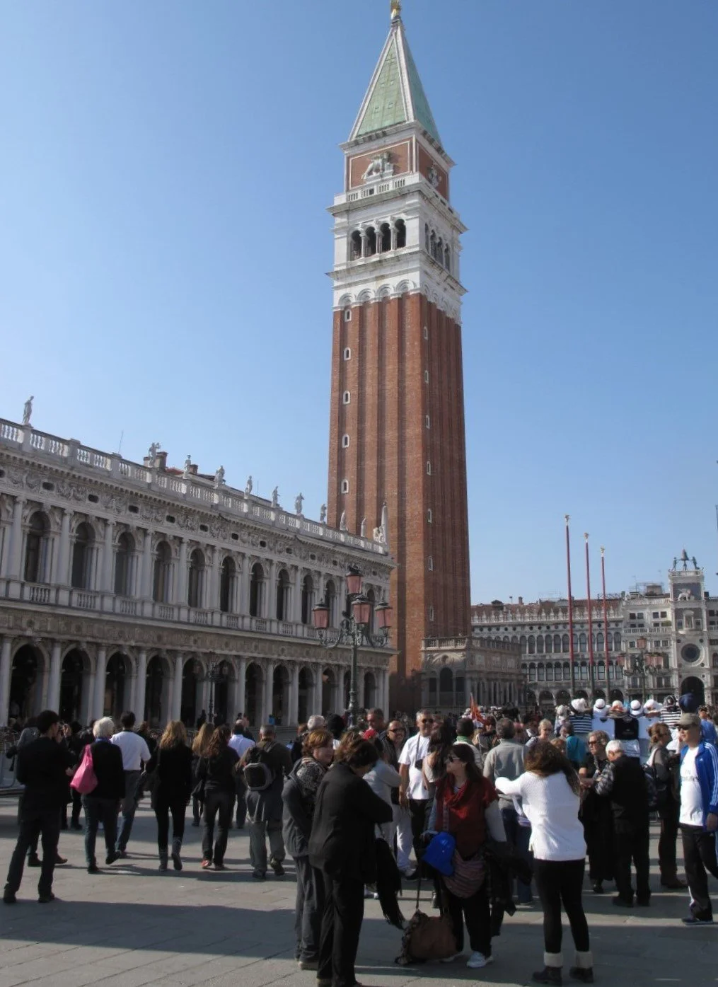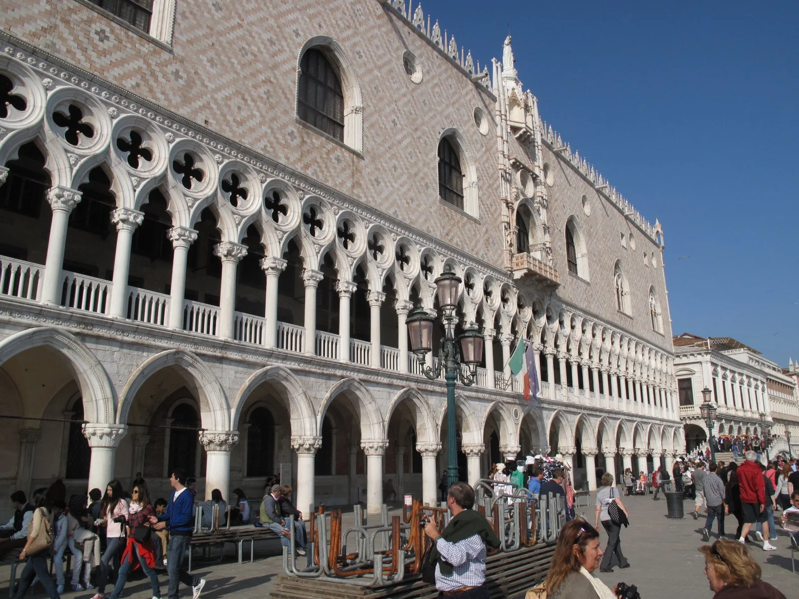 Venice was built on alluvial silt deposited by river discharge. The city’s unique geography has contributed to problems including ground subsidence caused by the extraction of freshwater from the underlying aquifer. Another persistent threat are flood tides from the nearby Adriatic Sea, especially during autumn and early spring months. In November 2019, water levels that peaked at 1.87 meters above normal, covered 80% of the city. Along with tourism (averaging 60,000 visitors per day), the city’s industries include ship building, trade, and services. Our hotel was close to Doge’s Palace (aka Palazzo Ducale). Historically, Doge Palace hosted government offices and served as a home for the elected leader of the Republic of Venice. The Doge presided over two empires, one in Italy and a second that included ports distributed across the Mediterranean, Black Sea, and Adriatic. Constructed on St. Mark’s Square in 810, Doge’s Palace was destroyed by a fire and reconstructed in 1340. Above the palace’s stone colonnade are Gothic quatrefoil openings cut into white Istrian stone. Damaged by other fires in 1483 and 1547, the palace became a museum in 1923.