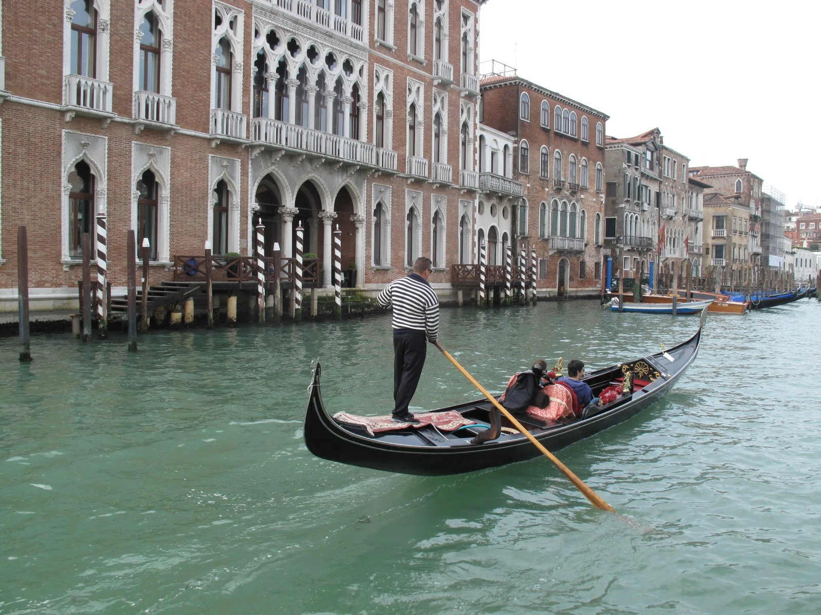 A trip to Venice is incomplete without a gondola ride, so we arranged for a private boat and guide to tour the Grand Canal (aka Canalazzo). The largest channel in Venice and a major corridor for carrying people and commerce, the Grand Canal is 3.8 kilometers long and 30 to 80 meters wide. From high above it looks like a reverse “S.” Along the canal’s banks are 170 buildings, most dating from the 15th through 20th centuries. Some feature Venetian Gothic styles (broken pediments and decorative cornices) painted in bright colors. In contrast to other waterways in Venice, just four bridges cross the Grand Canal. Our gondolier was dressed in traditional clothing that included a striped shirt, red neckerchief, and wide-brimmed straw hat. Used since the 11th century, the gondola is a flat-bottomed boat propelled by a single oar not attached to the hull. The boat is pushed forward from its stern using a sculling motion that also controls direction. Eleven meters long, gondolas are constructed from hundreds of hand-crafted pieces of wood, often a mixture of oak, larch, elm, and cherry.