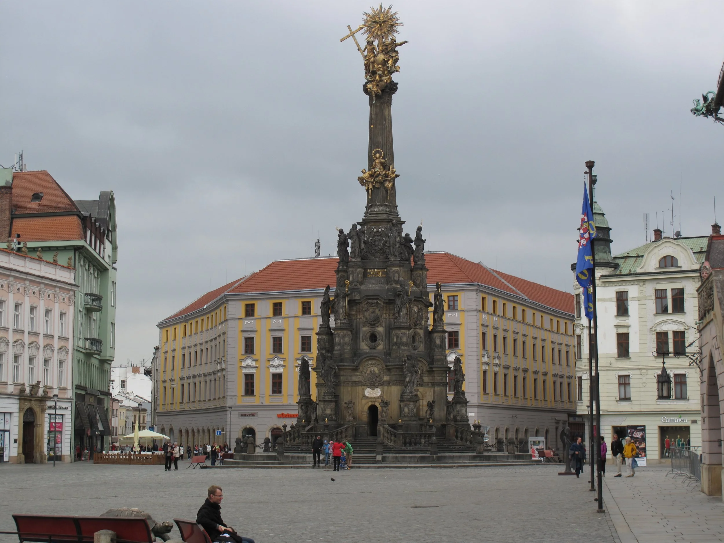 The Column of the Holy Trinity Olomouc is a Baroque monument (Trinity column) constructed to celebrate the end of a plague that struck the Czech Republic between 1713 and 1715. Near the top center of the column is a gilded cannonball, a reminder that the monument was hit by Prussian cannons during a siege in 1758. The Angel Gabriel is represented at the column’s top.
