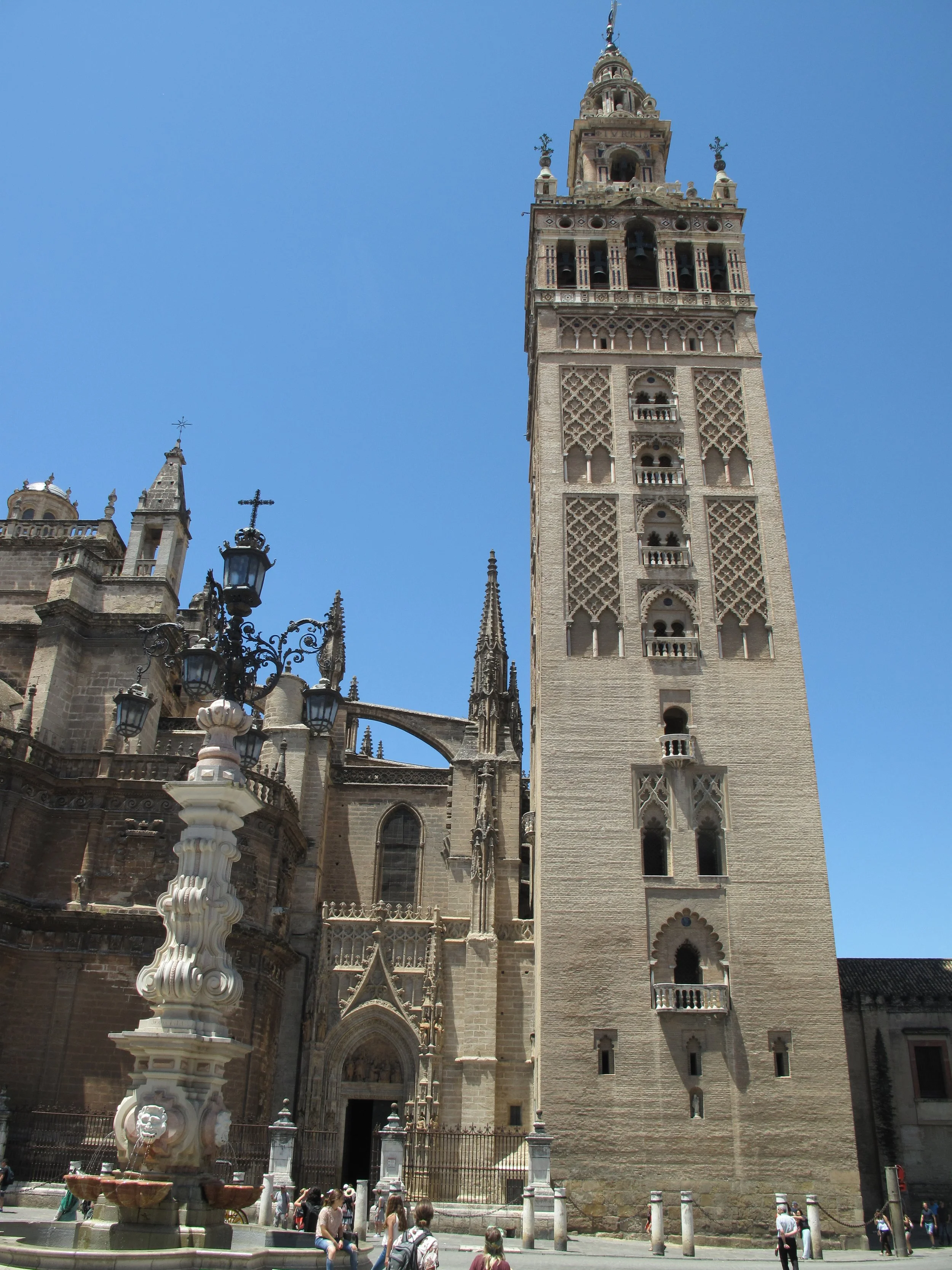 The Cathedral of Seville is the world’s largest Gothic Cathedral. It is located on the site of the Great Mosque of Seville, completed in 1198. While much of the mosque was torn down, its tall (50.5 meter) minaret called the Giralda, remained intact. The height of the Giralda Tower was later increased by 6.8 meters to accommodate a belfry. Giralda’s twin tower is in Rabat, Morocco. A replica can also be seen in Kansas City, Missouri.