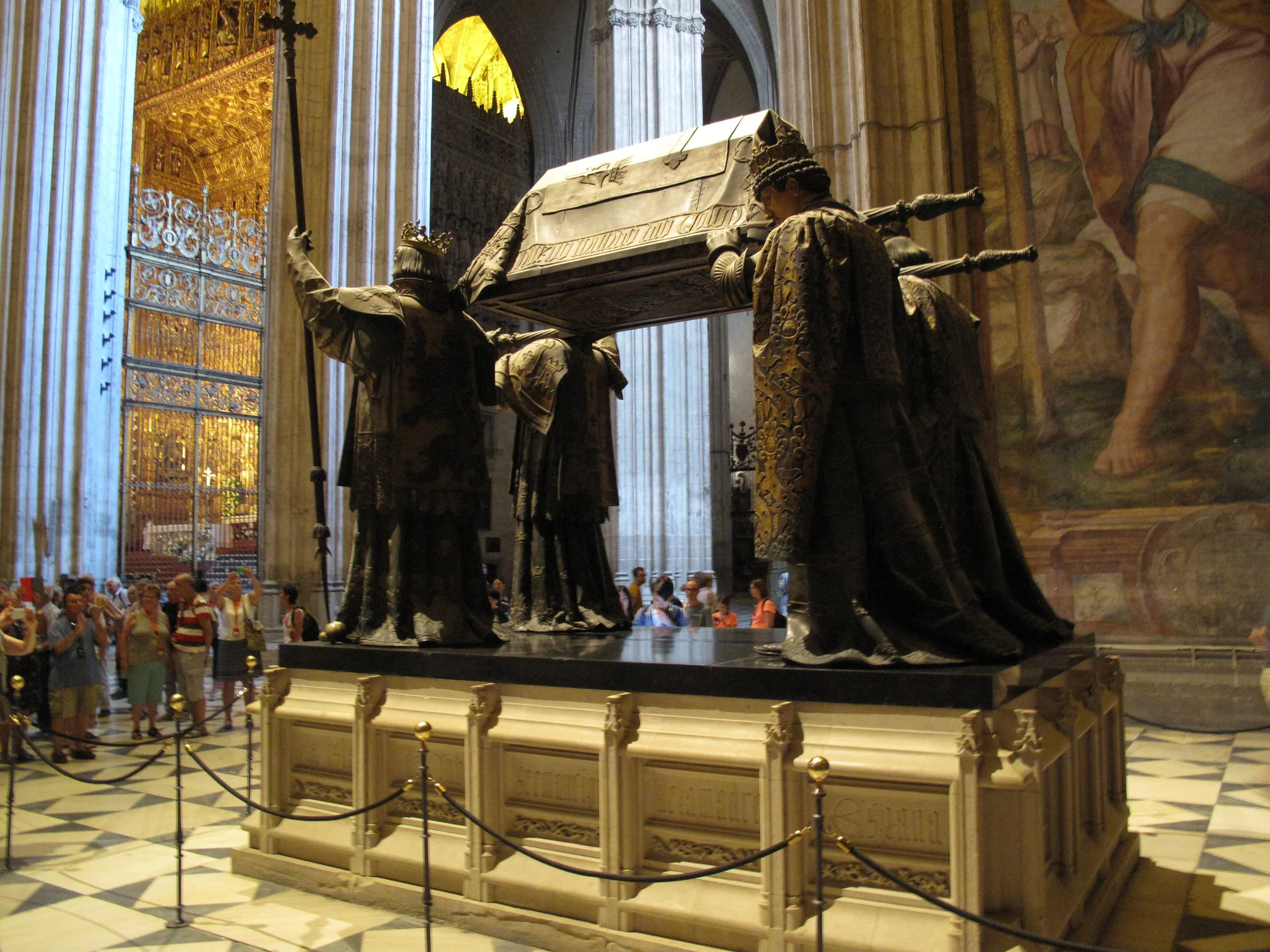 Inside Seville Cathedral is the tomb of Christoper Columbus (1451-1506). First interned on the island of Santa Domingo (now the Dominican Republic), the explorer’s remains were moved to Havanna, Cuba and finally, Seville. In 1899, Columbus’s remains were placed in a large tomb inside the cathedral’s entrance. The tomb features four carved figures carrying his coffin with each pallbearer representing the power and authority of one of Spain’s historic kingdoms: Aragon, Castile, León, and Navarre.