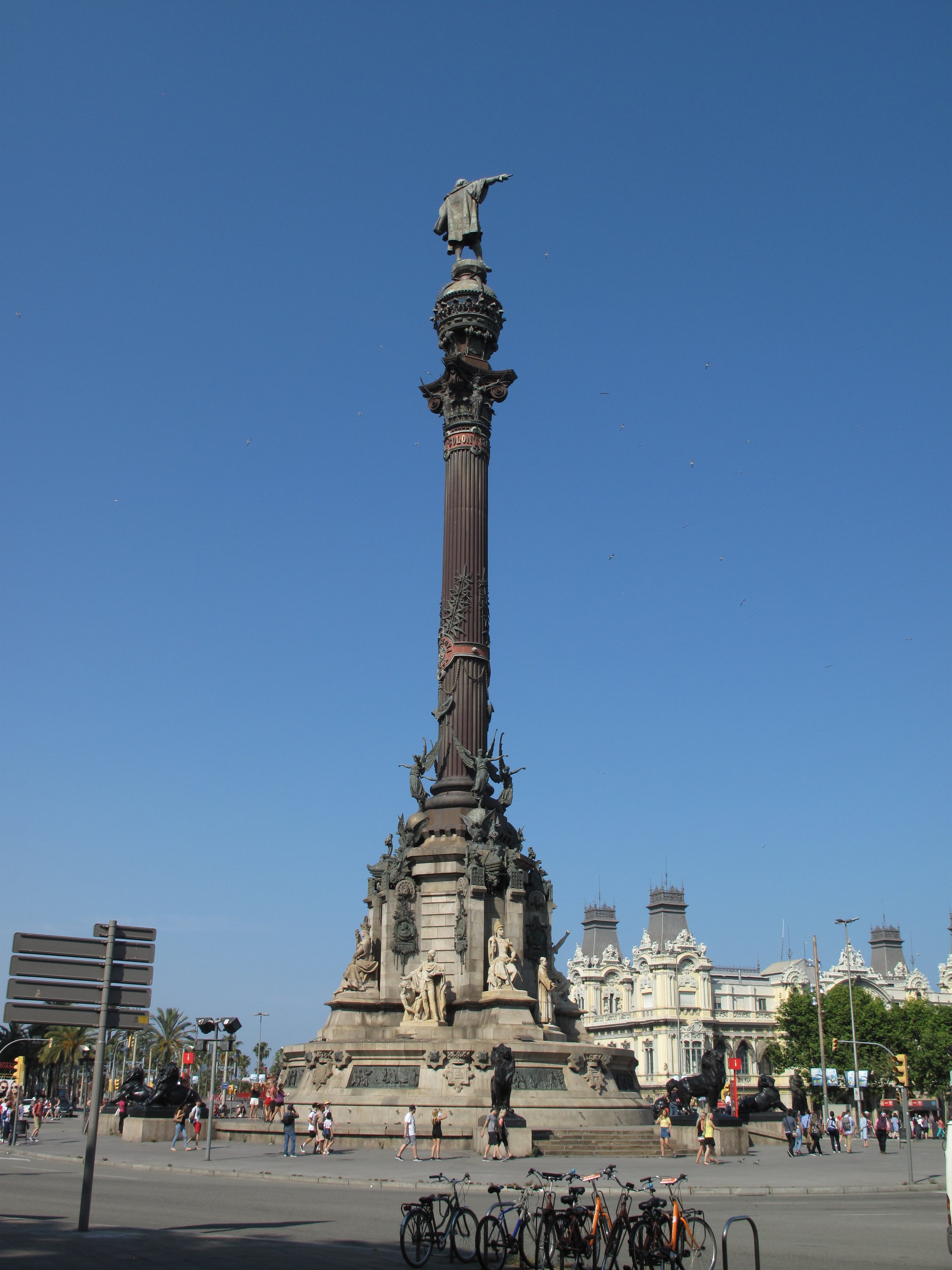 Barcelona’s sixty-meter-tall Columbus Monument was constructed for the 1888 Exposición Universal de Barcelona in honor of the explorer’s first voyage. A bronze statue of Columbus sits atop a 7.2-meter Corinthian column. Columbus is depicted pointing to the new world with his right hand and holding a scroll in his left hand. Around its base are four bronze phemes (winged angels) and statues of individuals associated with Columbus including Queen Isabella and King Ferdinand. Following protests in favor of removing the statue in 2020, Barcelona’s major announced that the statue would not be relocated.