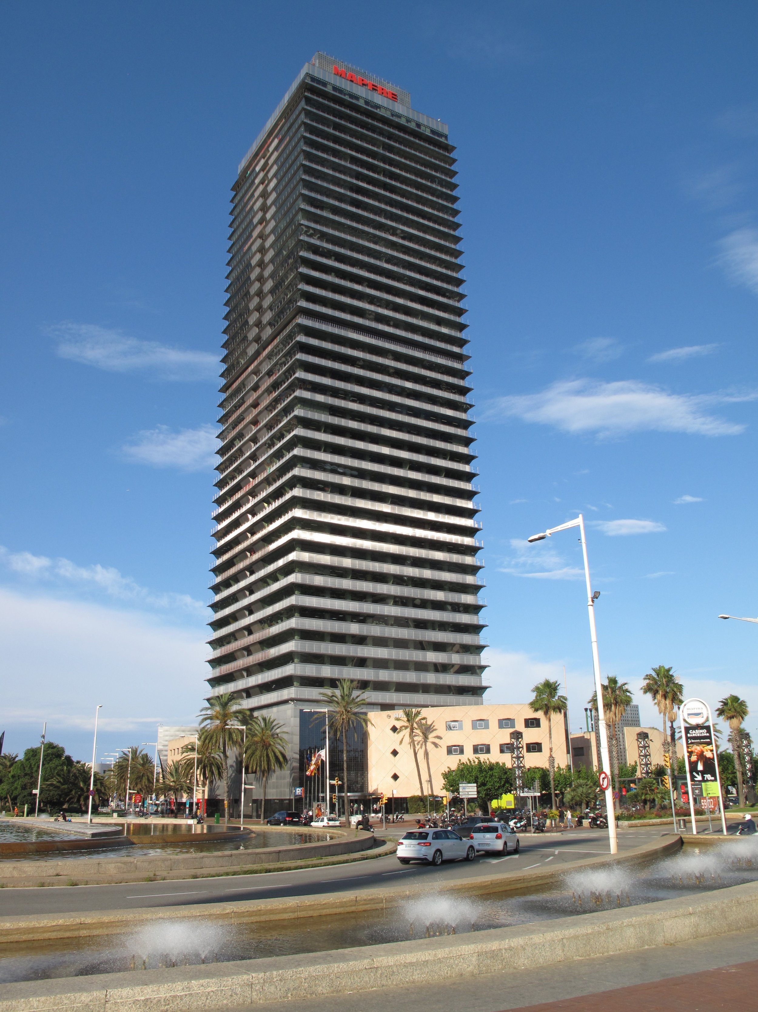 We stopped at Par Güell, an unusual park designed by Antoni Gaudí who was a major figure in the Aesthetic Movement that championed “art for art’s sake.” Located on a rocky hill called Montanya Pelada (Bare Mountain), the park was constructed over a fourteen-year period beginning in 1900. Its unique design comes from baroque elements. For example, a large terrace is framed by a long curving bench resembling a serpent. There are elevated pathways created from local stone flanked by fairytale-like houses. Elsewhere the designer cemented chopped pieces of ceramics to form mosaics. We passed the Mapfre Building, a skyscraper located in Port Olimpic (Olympic Port), a maritime neighborhood within the old part of Barcelona.
