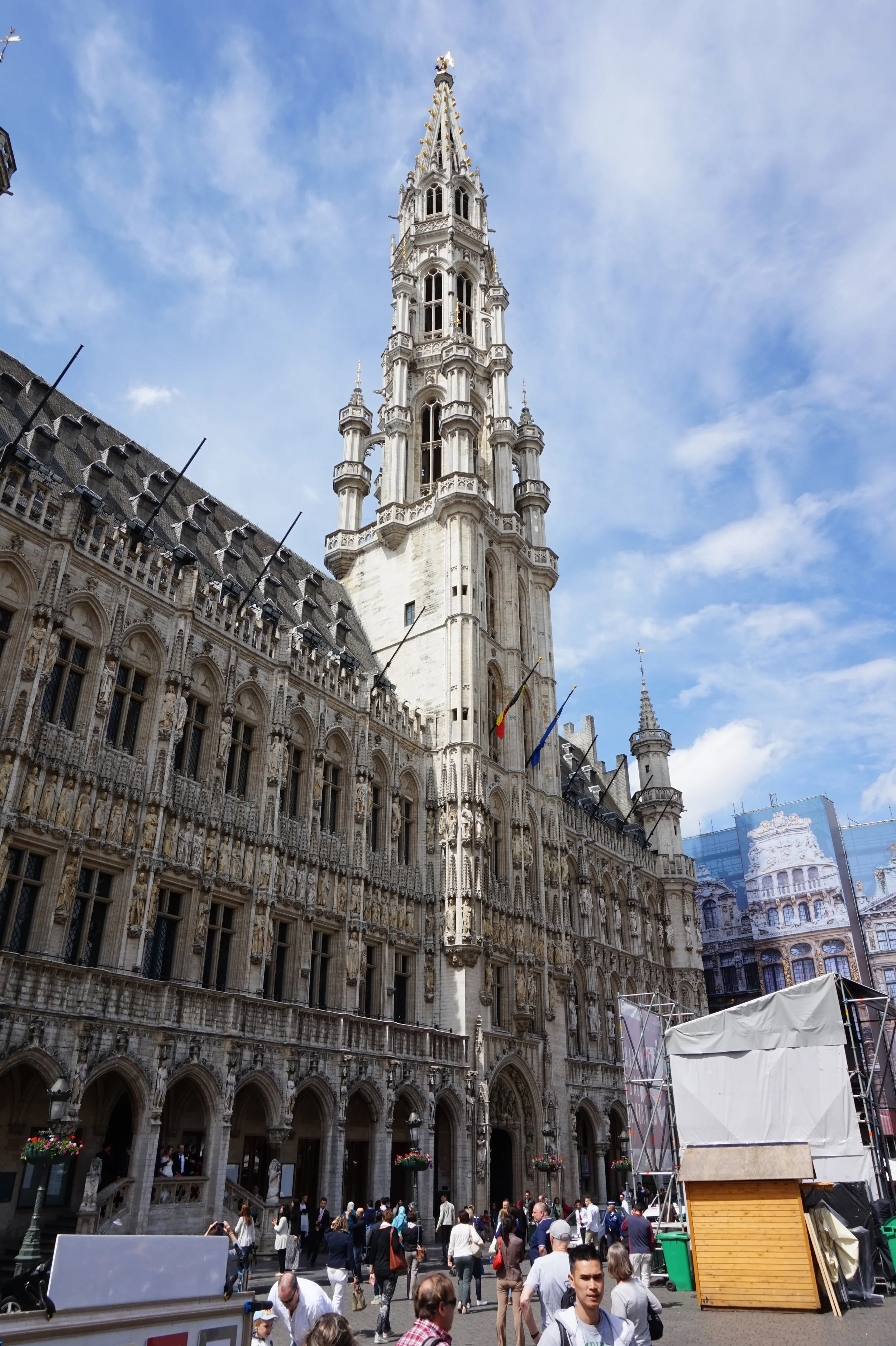 Today, the western part of Brussels (aka the “Lower Town”) is the commercial quarter while most upscale housing is found within the city’s south and southeastern sectors (the “Upper Town”). Traveling by bus, I was dropped off near Grand Palace Square (aka Grand Square) in the historic center of the city. Initially called Nedermerckt (Lower Market), Grand Square began as an open-air marketplace built on a former marsh. Today, the square is surrounded by ornate buildings including Guildhalls, a Baroque structure once used to administer the collection of taxes. Two other buildings on the square are Town Hall and Bread House (aka King’s House). Completed in 1455, Town Hall is Grand Square’s most visually imposing building. The last remaining medieval-era structure on the square, it features a 96-meter-tall tower that narrows to a pinnacle topped by a 2.7-meter statue of Saint Michael, patron saint of Brussels. The building’s exterior is decorated with statues of local nobility including dukes and dutchesses of Brabant and knights of the Noble Houses of Brussels. The building was damaged in 1695 when a 70,000 strong French army bombarded Brussels with the goal of drawing forces of the League Augsburg away from an attack on the French city of Namur. During WWI the building was used as a makeshift hospital. Bread Hall (in Dutch, Broodhuis and in French Maison du Roi) is a neo-Gothic building constructed in the 13th century as a bread market. Today, it houses the city museum.