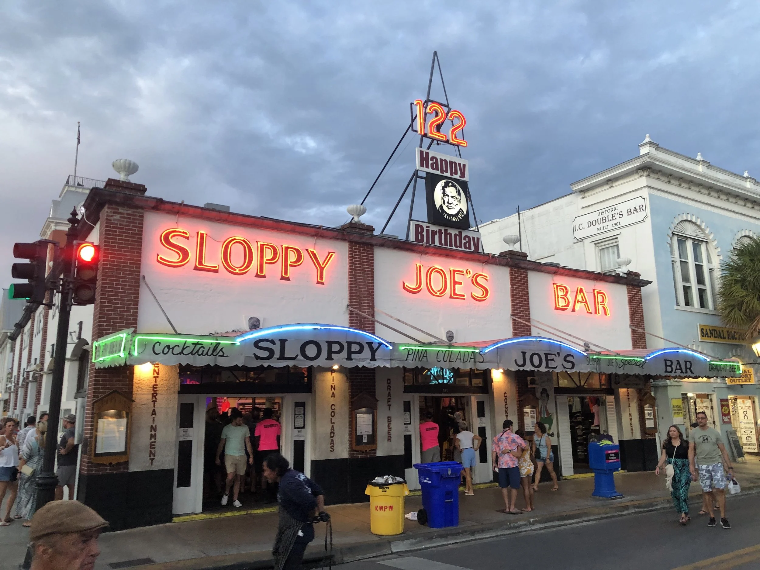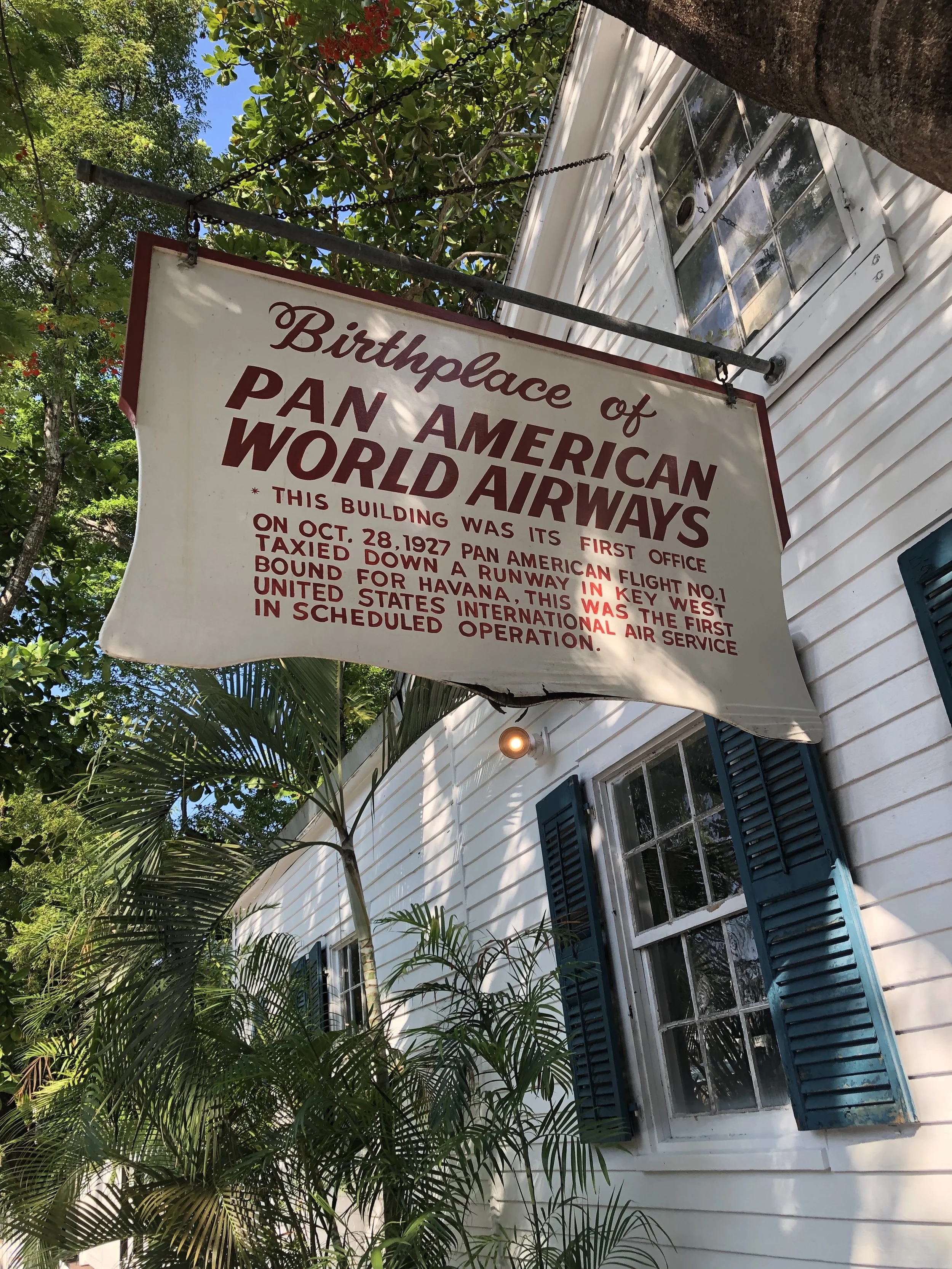 Key West’s famous Sloppy Joe’s bar was initially located on the corner of Greene and Duval Streets (the bar moved to 201 Duval Street when the lease expired on the original building). Known as the Blind Pig and then Key West Saloon, the bar was established on December 5, 1933, the day Prohibition was repealed. Eventually, the bar experienced a third name change. “Sloppy” came from the bar’s floor always being wet and “Joe’s” from the José Garcia Havana Club in Cuba. Sloppy Joe’s became Hemingway’s favorite “watering hole,” a place he would visit after a long day of writing and/or fishing. Today, Sloppy Joe’s is open daily from 10am to 4am. Each July the bar hosts a celebration of Hemingway’s life that includes a look-alike contest. We were fortunate to visit on the day finalists were being vetted by patrons. Another walk took us to Southernmost Point, a Foux concrete buoy that marks the southernmost point in the U.S. Although convenient for tourists because of its location on the main island, the marker isn’t the true southernmost place in the 48 contiguous states since the beach at Fort Zachary Taylor State Historic Site is farther south. So is Ballast Key, located sixteen kilometers to the southwest. Once among the largest airlines in the world, Pan American Airlines was founded in Key West. The airline got its start flying passengers from Key West to Havanna, Cuba in the mid-1920s using three-engine Ford Trimotor aircraft. In 1991, Pan Am filed for bankruptcy. Today, the former Pan Am headquarters and ticket office are part of a bar called “First Flight.” My wife and I and our friends ordered drinks there.