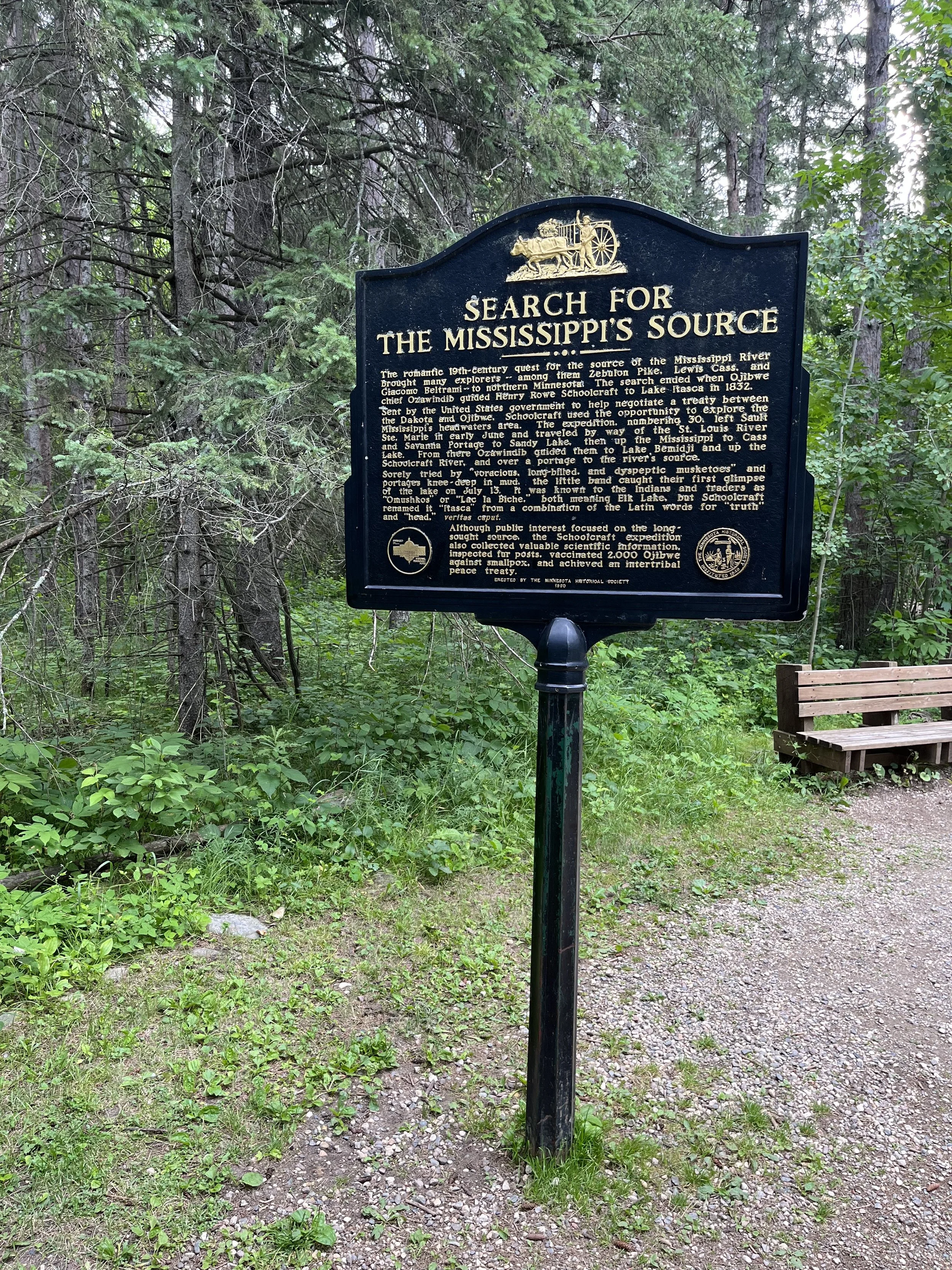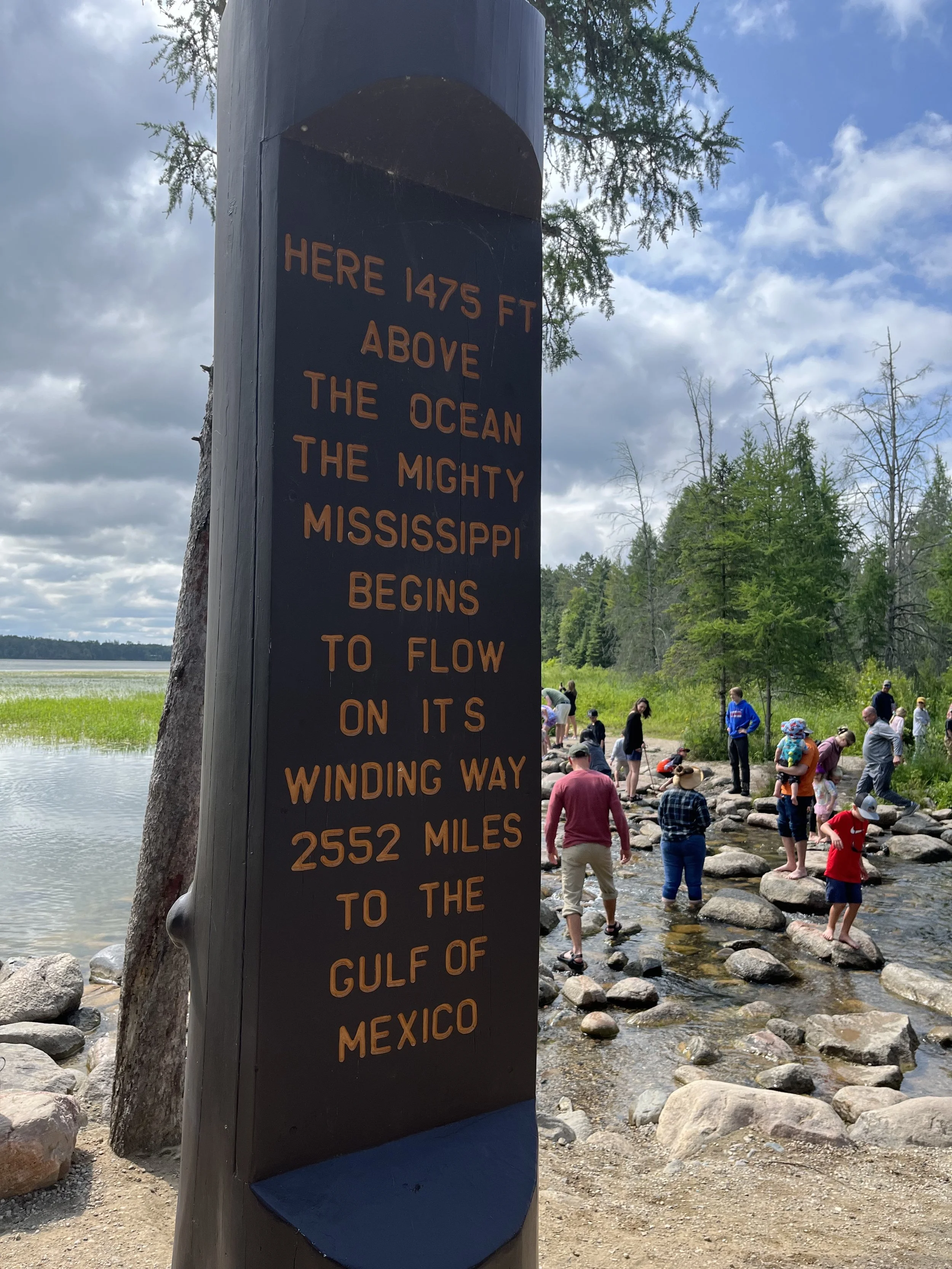 Today the precise location where the river begins is a small rock dam on Lake Itasca. After parking we followed a short trail to the dam which is surrounded by a few tamarack trees. Further from the riverbank are old growth red and white pines. The larger area surrounding the park is home to wolves, loons, red-necked grebe, and trumpeter swans. Nearly a half million people visit Itasca State Park every year to see the river’s headwaters with many wading between its banks so they can proclaim, “I walked across the Mississippi River.” According to a local legend, people who cross the river at this place will live a long and happy life.