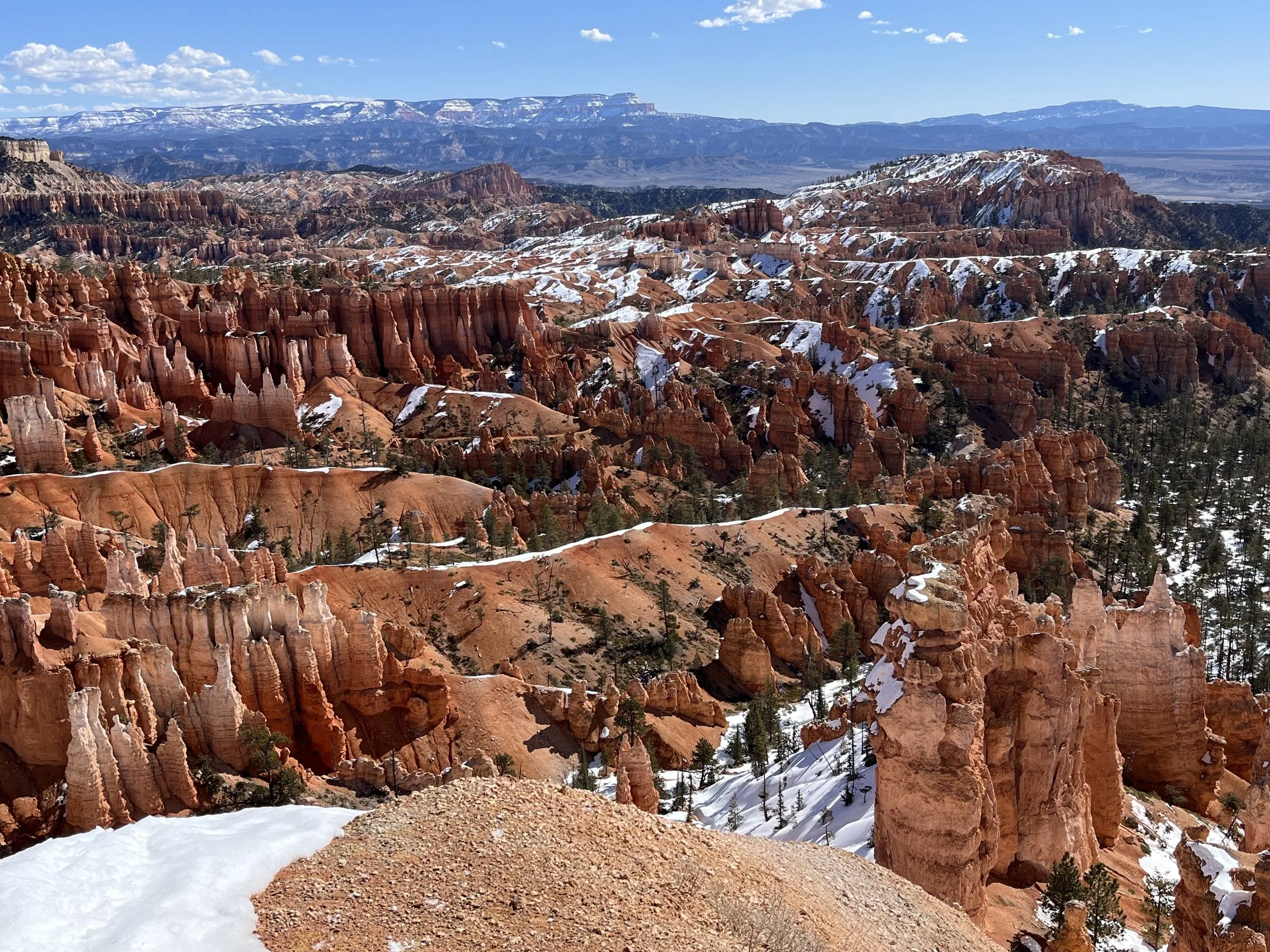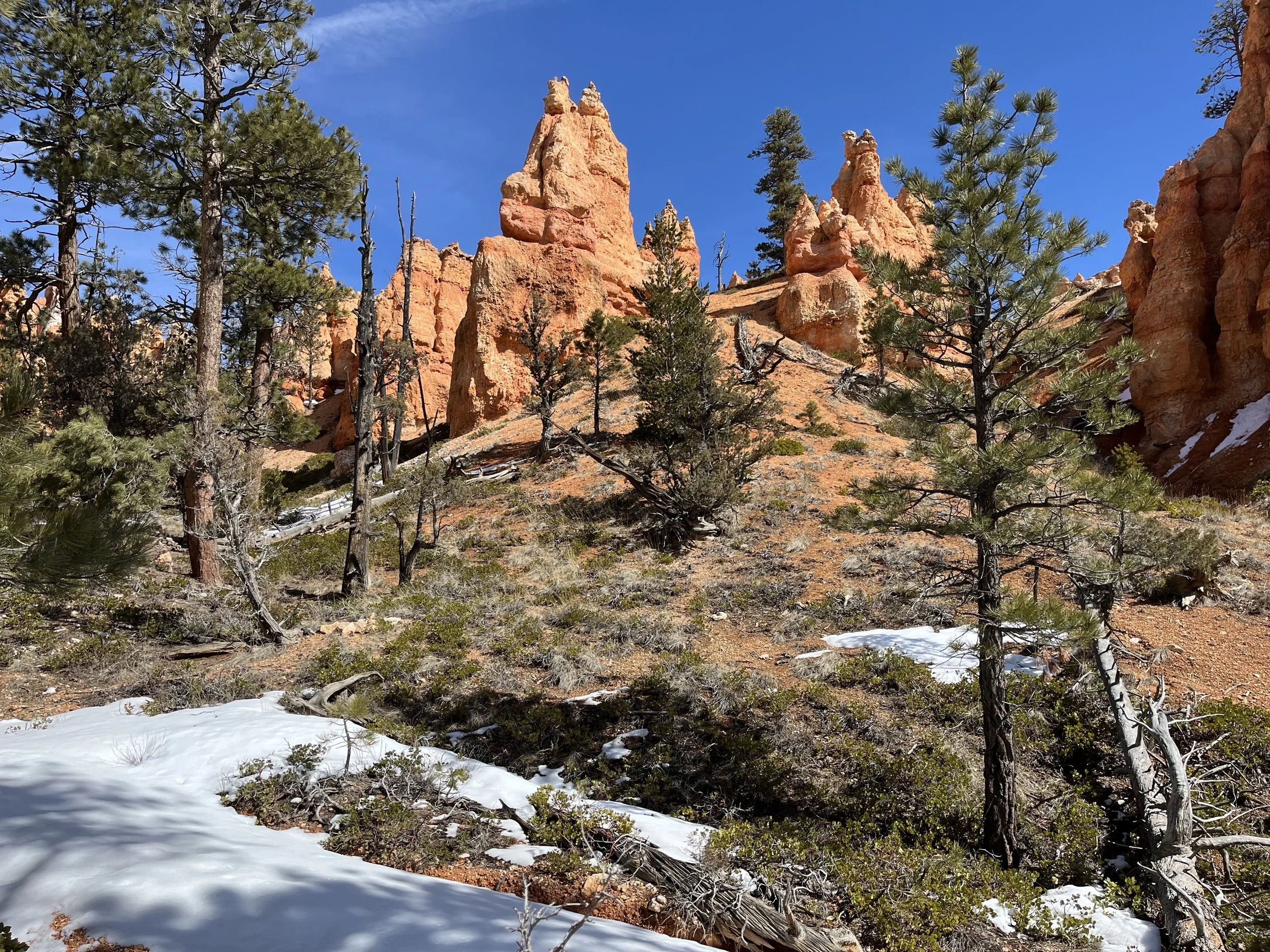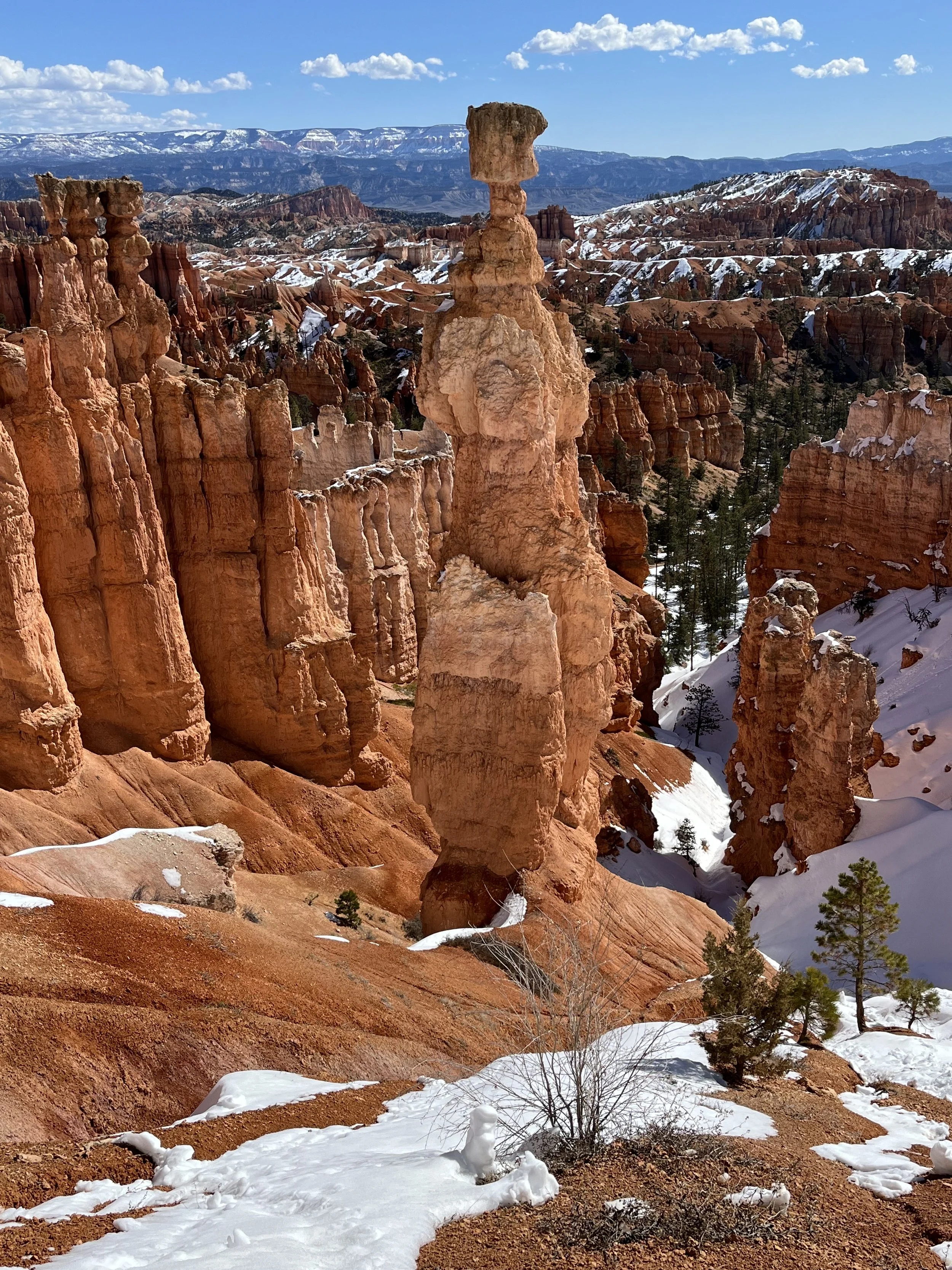 Our route to reach the park followed Highway 12 west from Zion National Park and then south on Highway 63 to the entrance station. After a brief stop at the visitor center, we drove the 29-kilometer Rim Road, pausing at most of the park’s thirteen overlooks including Rainbow Point, the park’s highest location (2,775m). Parking near Sunset Point, we set out to complete a segment of trail offering views of Bryce Amphitheater that would take us below the rim and along a loop that terminated at Sunrise Point. Nineteen kilometers long and 250 meters deep, Bryce Amphitheater is the park’s largest feature. We followed two out-and-back trails, Navajo Loop and Queens Garden. The initial descent into Bryce Amphitheater is a series of steep switchbacks. I slipped on sections of the trail still covered by patches of winter snow and ice. At the second switchback we stopped to photograph Thor’s Hammer, one of the park’s most iconic hoodoos that is formed by a rock column topped by a chunk of caprock. The route continued past rock formations carved by differential weathering including the “Gossips,” “Organ Grinder’s Monkey,” and “Queen Victoria.” Our final kilometer involved a climb back to the rim.