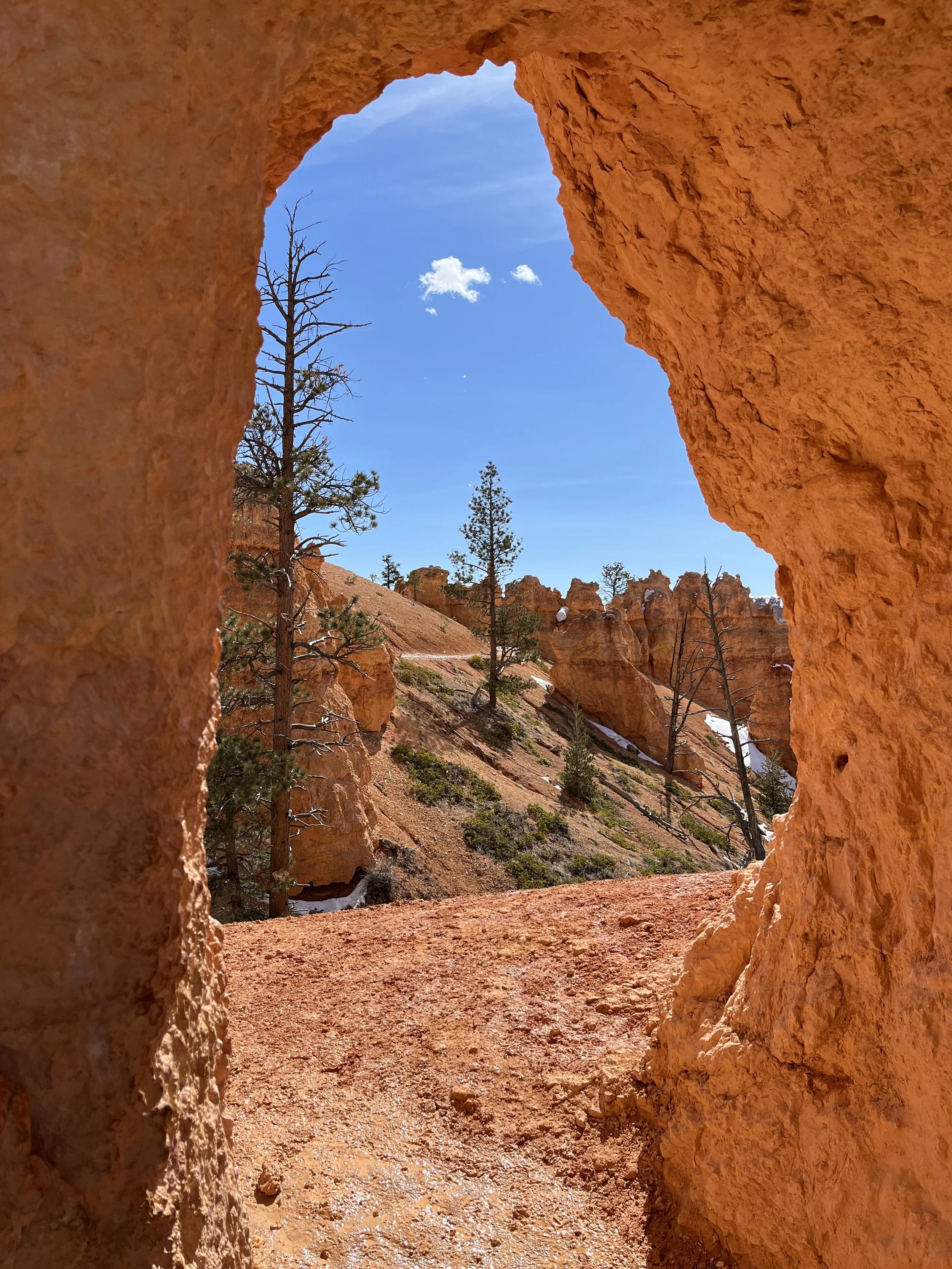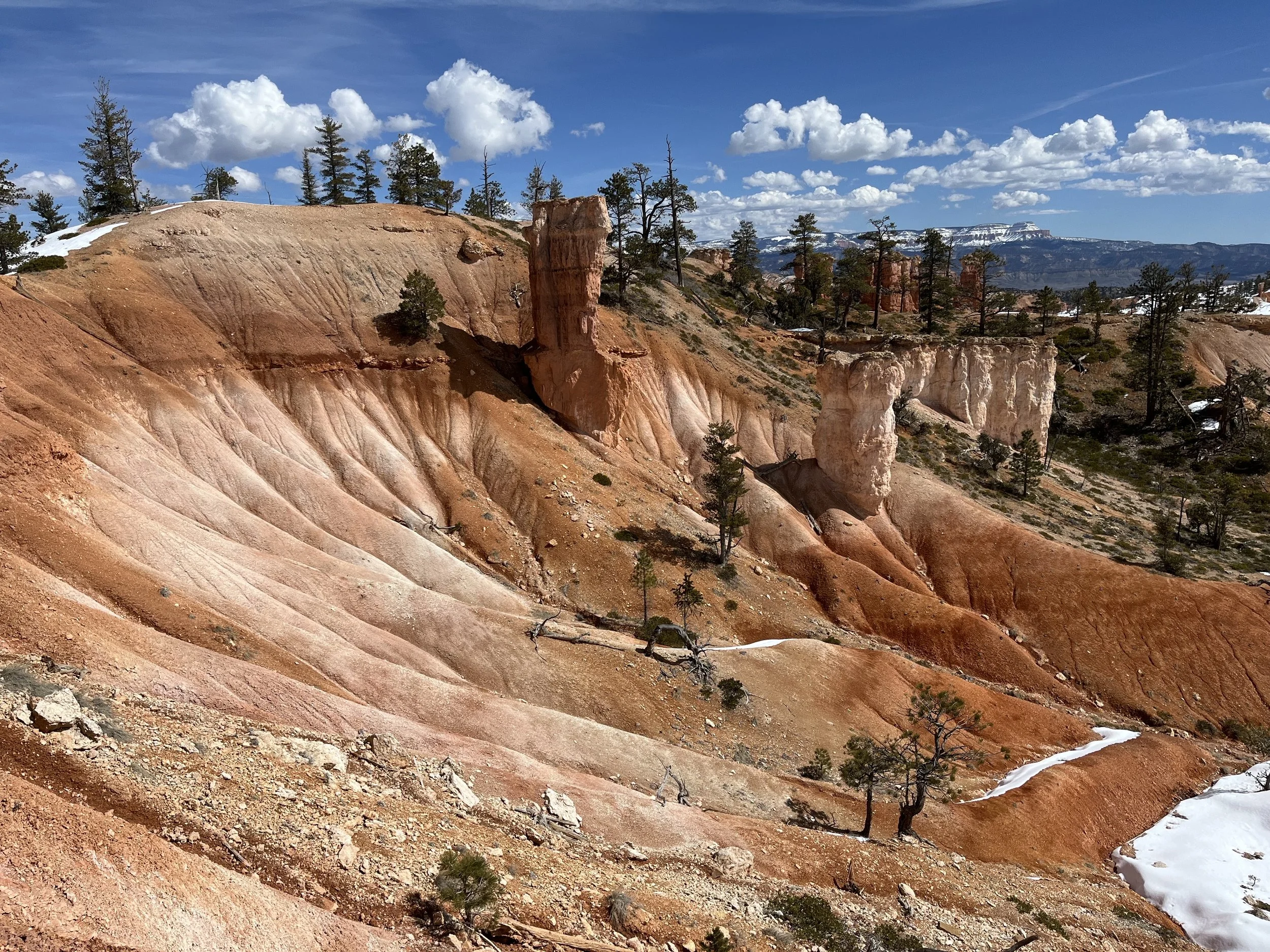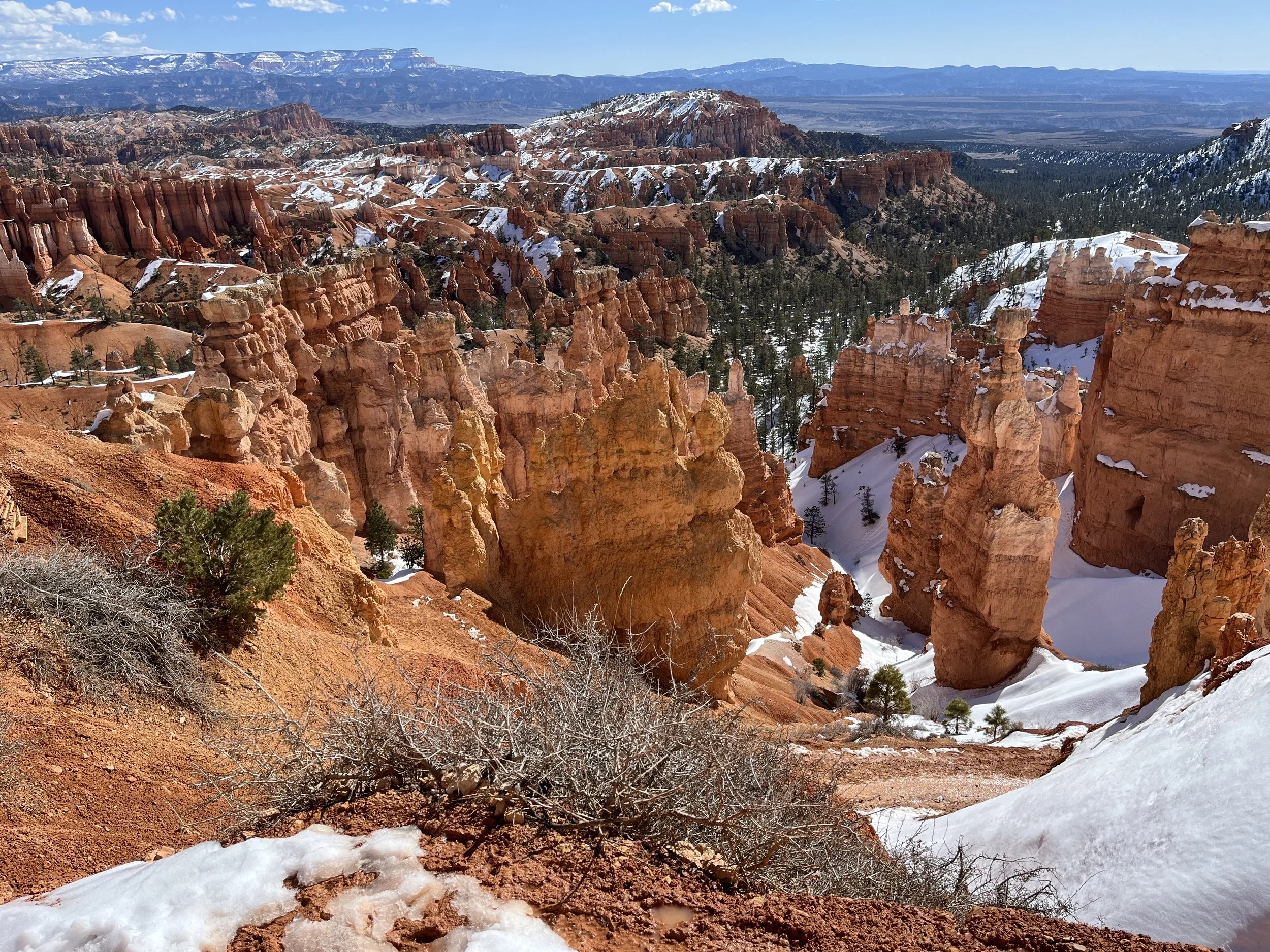 Our route to reach the park followed Highway 12 west from Zion National Park and then south on Highway 63 to the entrance station. After a brief stop at the visitor center, we drove the 29-kilometer Rim Road, pausing at most of the park’s thirteen overlooks including Rainbow Point, the park’s highest location (2,775m). Parking near Sunset Point, we set out to complete a segment of trail offering views of Bryce Amphitheater that would take us below the rim and along a loop that terminated at Sunrise Point. Nineteen kilometers long and 250 meters deep, Bryce Amphitheater is the park’s largest feature. We followed two out-and-back trails, Navajo Loop and Queens Garden. The initial descent into Bryce Amphitheater is a series of steep switchbacks. I slipped on sections of the trail still covered by patches of winter snow and ice. At the second switchback we stopped to photograph Thor’s Hammer, one of the park’s most iconic hoodoos that is formed by a rock column topped by a chunk of caprock. The route continued past rock formations carved by differential weathering including the “Gossips,” “Organ Grinder’s Monkey,” and “Queen Victoria.” Our final kilometer involved a climb back to the rim.