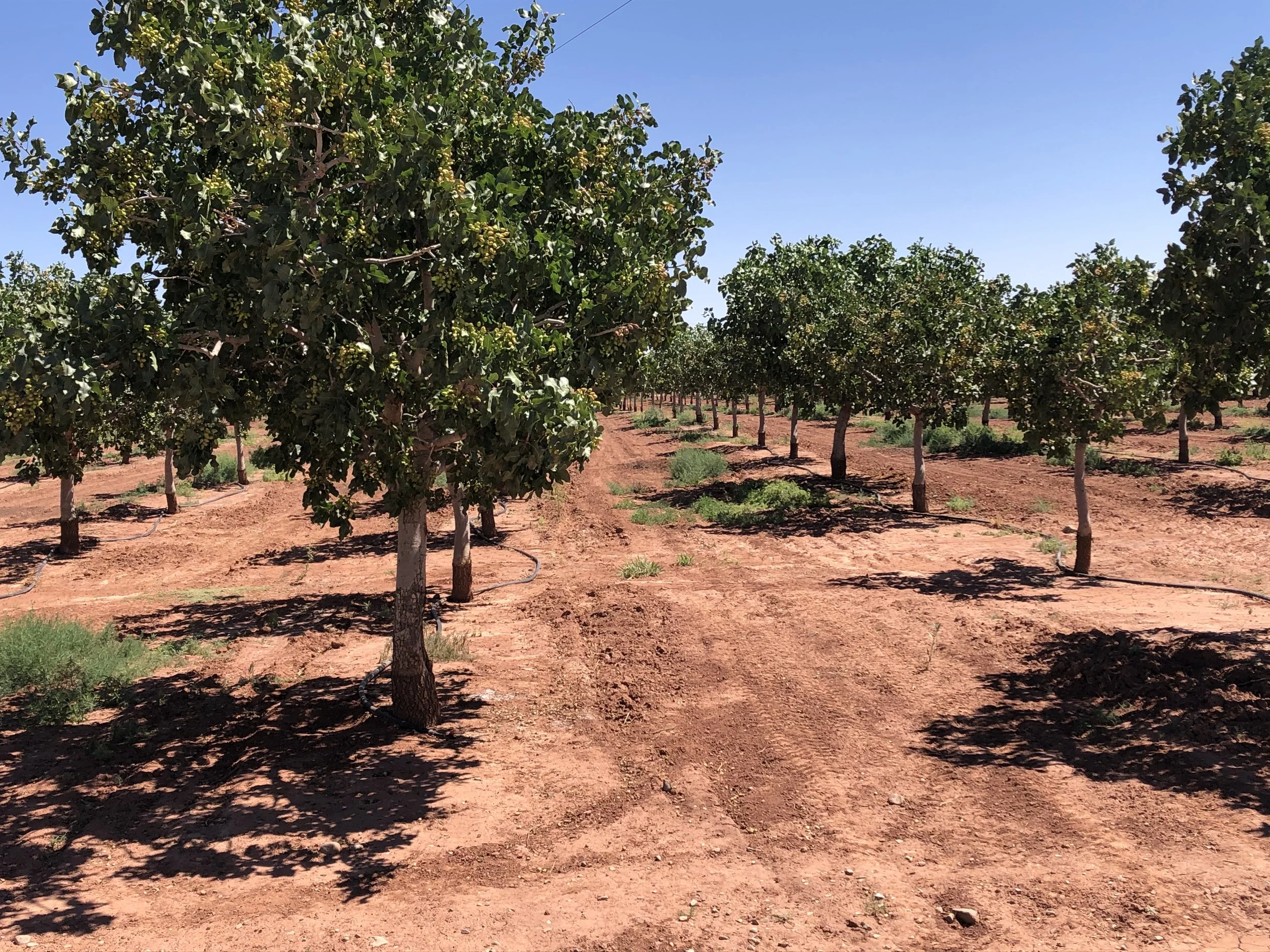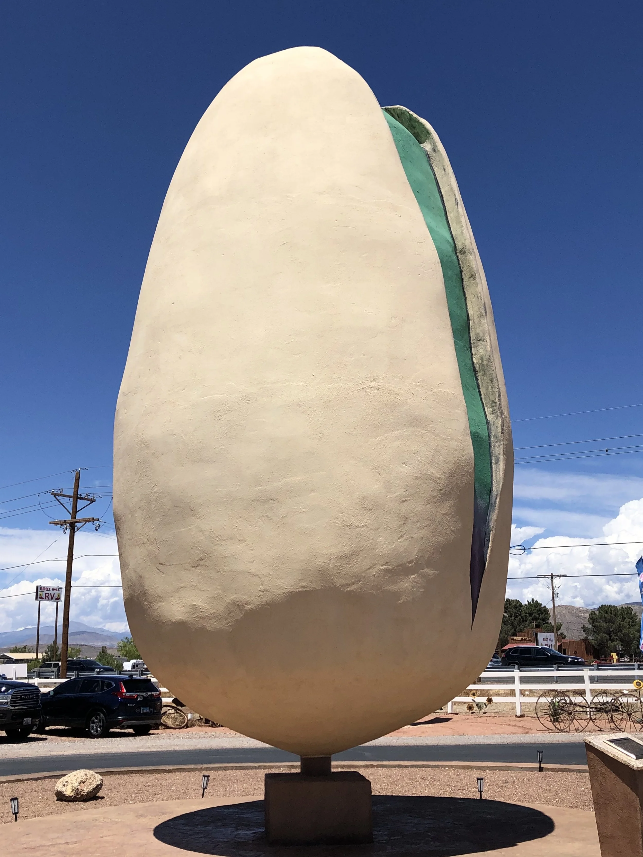 Returning to Alamogordo, we stopped at Pistachioland for a look at the world’s tallest pistachio, a bulbous, ten-meter-tall sign. Built in honor of Tom McGinn, the sign, along with the farm and store, are located on Highway 70 and eleven kilometers north of Alamogordo. The McGinn family continues to operate the store and adjacent orchard with its 12,300 pistachio trees. The farm also has 7,500 grape vines that support the Arena Blanca Winery. My travel companion and I paid a small fee for a one-hour tour of the 36.4-hectare farm.