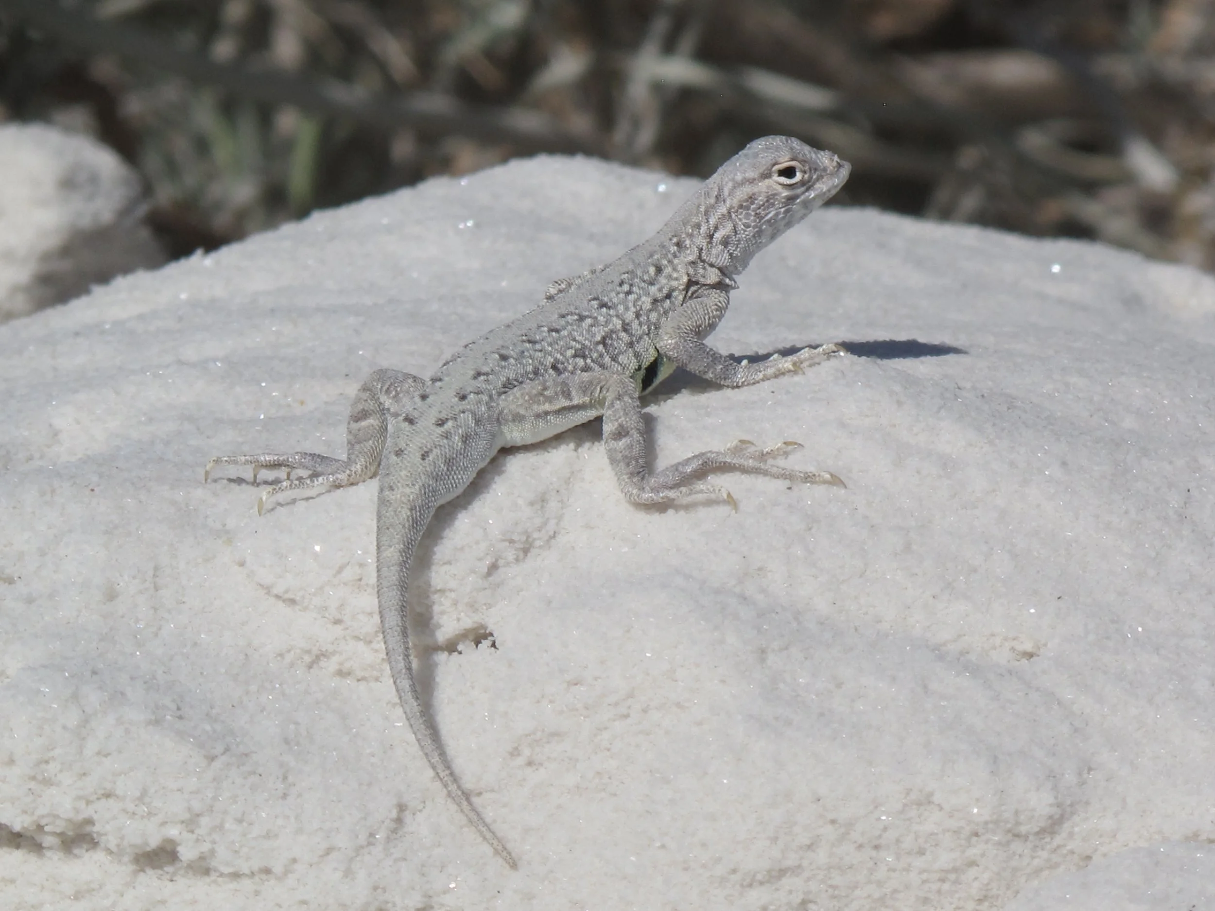 White Sands became a national monument in 1933 and a national park in 2019. Dunes within the park rise to heights of eighteen meters and depths of up to nine meters. The landscape has both transverse and barchan dune types with sands that migrate up to ten meters a year. The dunes are taller in western areas of the park and progressively shorter in the east. The park’s desolate landscape has been featured in numerous films including Hang ‘Em High (1968) and The Book of Eli (2010). We took the thirteen kilometer “Dunes Drive” from the visitor center to the western-most parking area. The park has 300 plant species, 50 animal species, 30 reptile species, and 600 species of invertebrates. Plants must adapt to nutrient-poor soil that has a high alkali concentration. Animals range from kangaroo rats and ravens to wrens, kit fox, bobcats, and jack rabbits. Among the park’s reptiles, the Bleached Earless Lizard has a unique white collar. About 70 centimeters long, it eats wasps, beetles, ants, and bees.