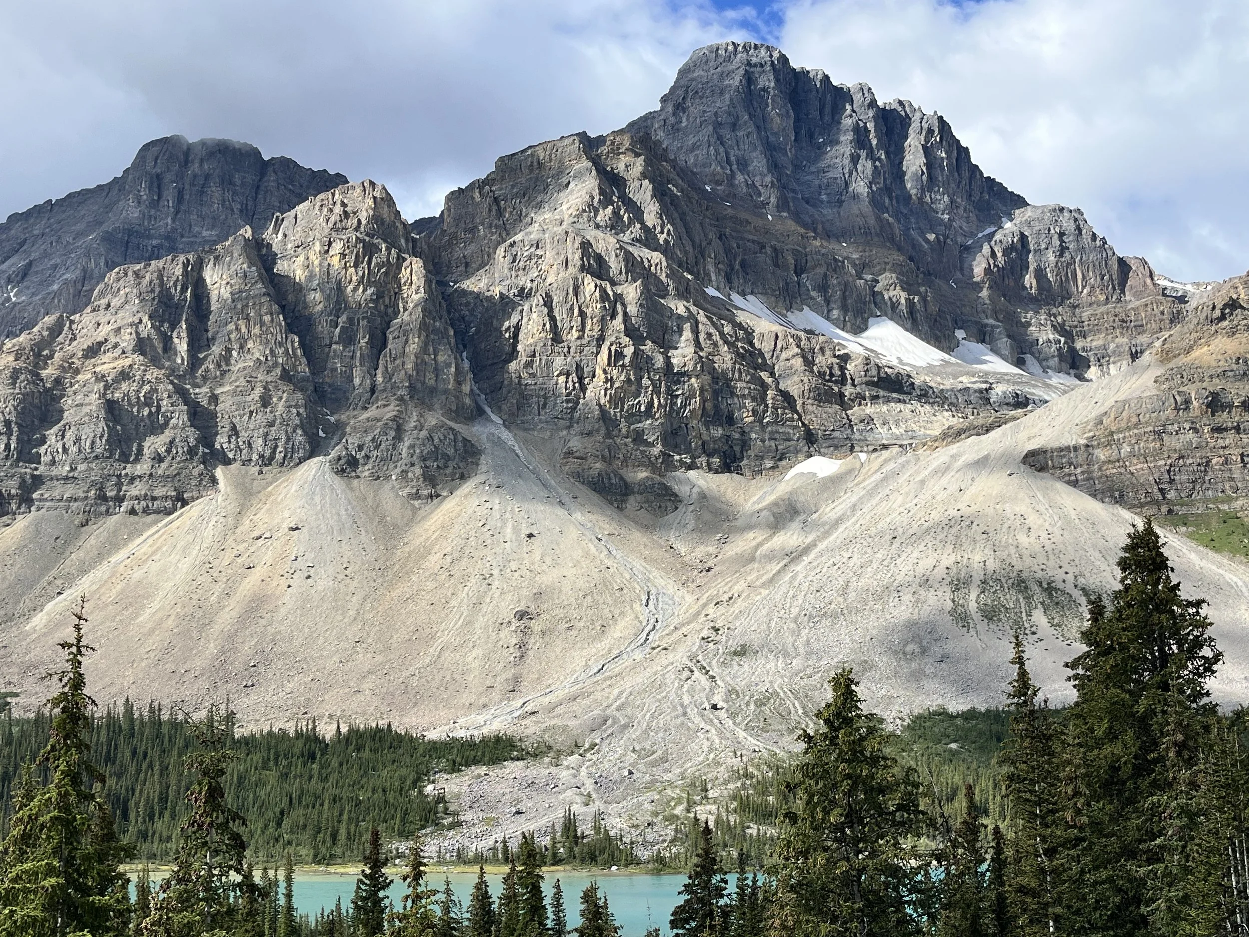 The Canadian Rockies have a different look and feel compared to the Rocky Mountains of New Mexico, Colorado, and Wyoming. Whereas mountains in the lower U.S. states often have a high tree line with tundra and rock only at the highest elevations, peaks of Alberta’s Rockies are more visually imposing with ridgelines of ragged rock and steep cliffs flanked by sloping talus aprons. The Canadian Rockies were formed through uplift and erosion over more than 70 million years. They are composed of sedimentary rock, mostly sandstone, shale, and dolomite, from the Precambrian through the Cretaceous periods (600 million to 66 million years ago). The distinctive look of the Canadian Rockies can also be attributed to a 40 to 60° dip in layers of sedimentary strata that forms sawbacks and dogtooth features. Subsequent reshaping by glacial action has left cirques (ragged ridgelines), arêtes (sharp peaks), and U-shaped valleys.