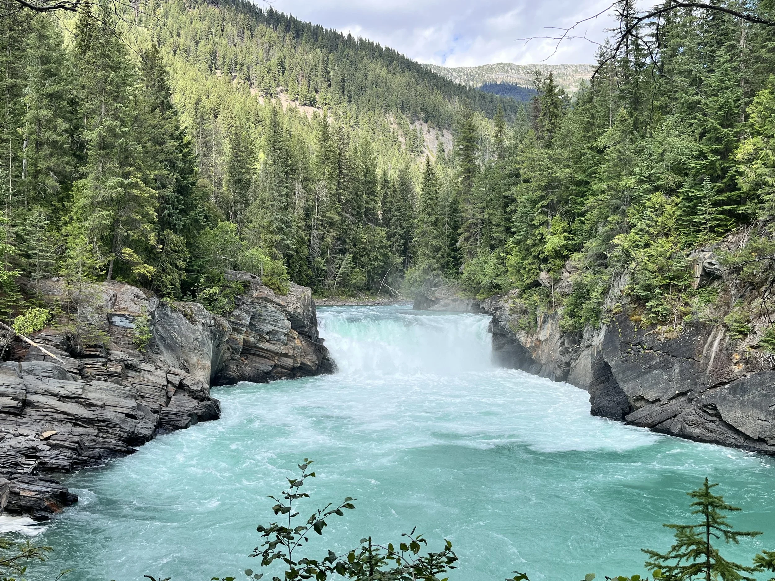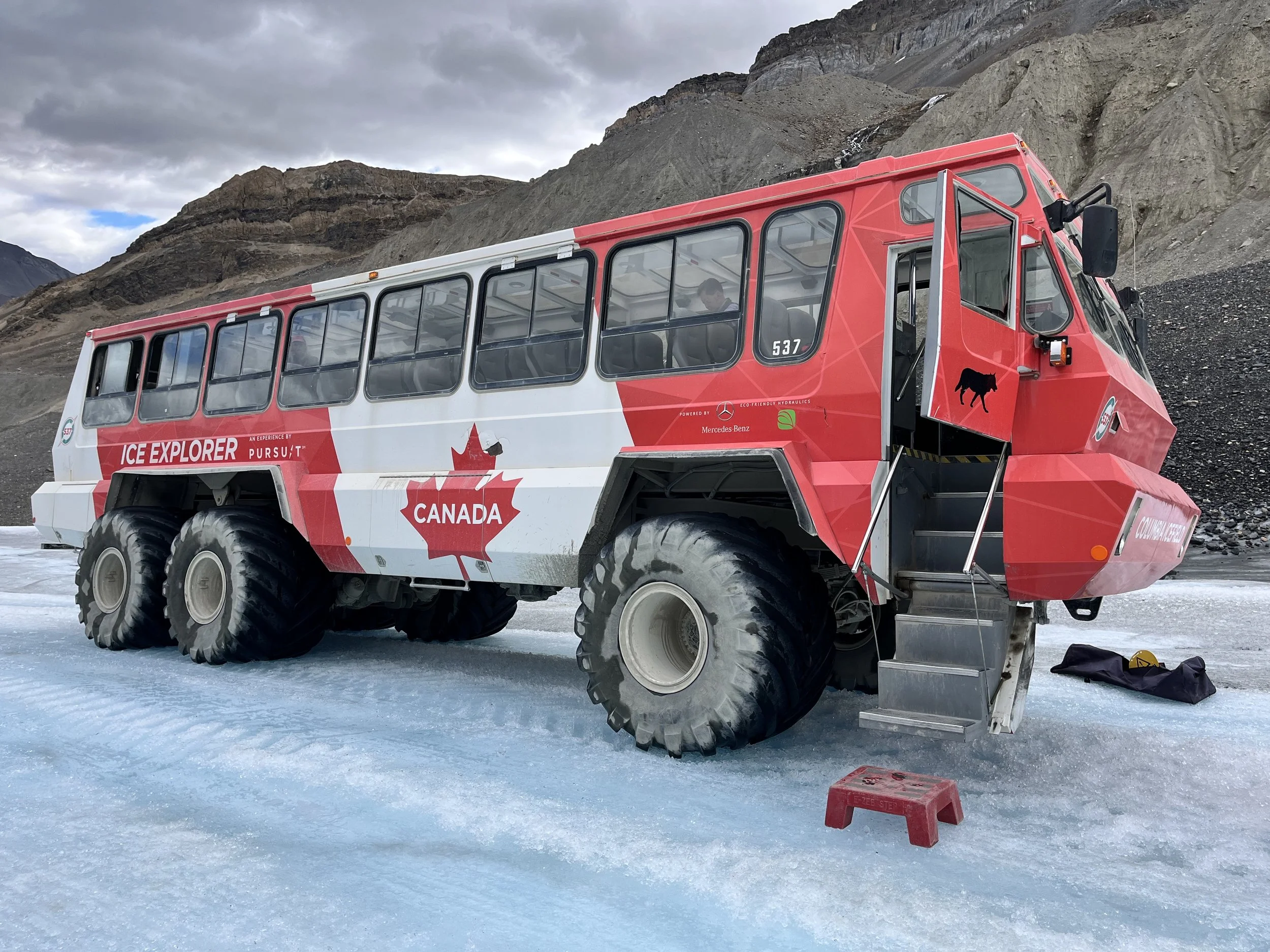The highlight of our visit was the Columbia Icefield. Stretching across parts of Banff and the adjacent Jasper National Park, the 240,000-year-old icefield is a remnant of an icesheet that once covered much of western Canada. With glacial ice up to 365 meters thick (the height of New York City’s Empire State Building), the icefield’s central dome is one of two triple continental divides in the world. Triple divide status means that water originating from the dome’s melting snow and ice flows into three oceans: the Atlantic, Pacific, and Arctic. Surrounded by eleven of Canada’s twenty-two highest peaks, the Columbia Icefield is also a UNESCO World Heritage Site. Our first stop was the icefield visitor center. Across a valley we could see the Athabasca Glacier flowing towards us and downslope from the icefield. Located in the Sunwapta Valley, the glacier is about six kilometers long and covers a surface area of six square kilometers. Climate change has reduced the geographic dimensions of both the icefield and glacier. We took seats in a bus for the short drive to a parking area where we boarded an all-terrain “Ice Explorer” with space for fifty riders. Equipped with a 250 horsepower Detroit diesel engine, the vehicle has a specially designed suspension and low-pressure tires for improved traction. The section of road leading to the glacier has some of the steepest grades in the world. At 32° it is slightly less steep than Baldwin Street (35°) in Dunedin, New Zealand. The route has other hazards. In 2020 three people were killed and 24 injured when an Ice Explorer was struck by a rockslide. Our route took us over 10,000-year-old glacial ice. Arriving at a relatively level place on the glacier, we were permitted to disembark for a short walk after receiving instructions to exercise caution and avoid crevasses in the ice. For our return trip a squirrel ascended steps into the Ice Explorer and quickly disappeared under the seats. Our driver explained that such stowaways are relatively common.
