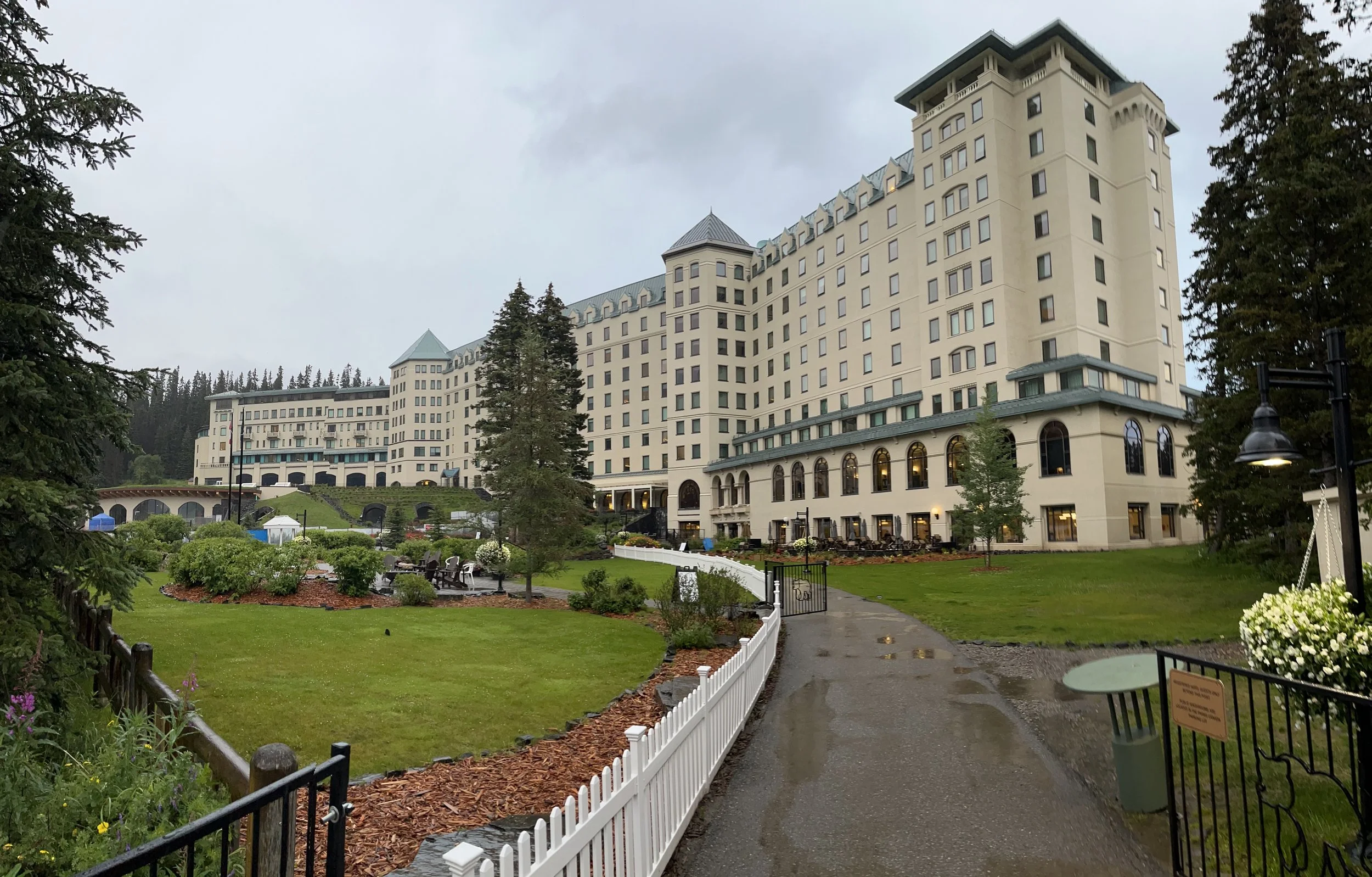Knowing that the parking lot at Lake Louise is small and often full by 7am, we departed our hotel in the city of Banff just after 5:30am. Positioned at an elevation of 1,600 meters, Lake Louise offers stunning views of Mount Victoria. The alpine lake isn’t especially large, measuring just two kilometers in length and 0.5 kilometers in width. In the indigenous language the lake is called Num-Nay which means “lake of little fishes.” Although an early European surveyor dubbed it Emerald Lake, the lake was formally named after the wife of the Governor-general of Alberta, Princess Louise. The lake’s water temperature never rises above 4°C while its surface remains frozen during winter months. It was raining so we visited a coffee shop on one end of the Chateau Lake Louise Hotel. Although most of the hotel isn’t open to the public, we were able to walk through part of the lobby.