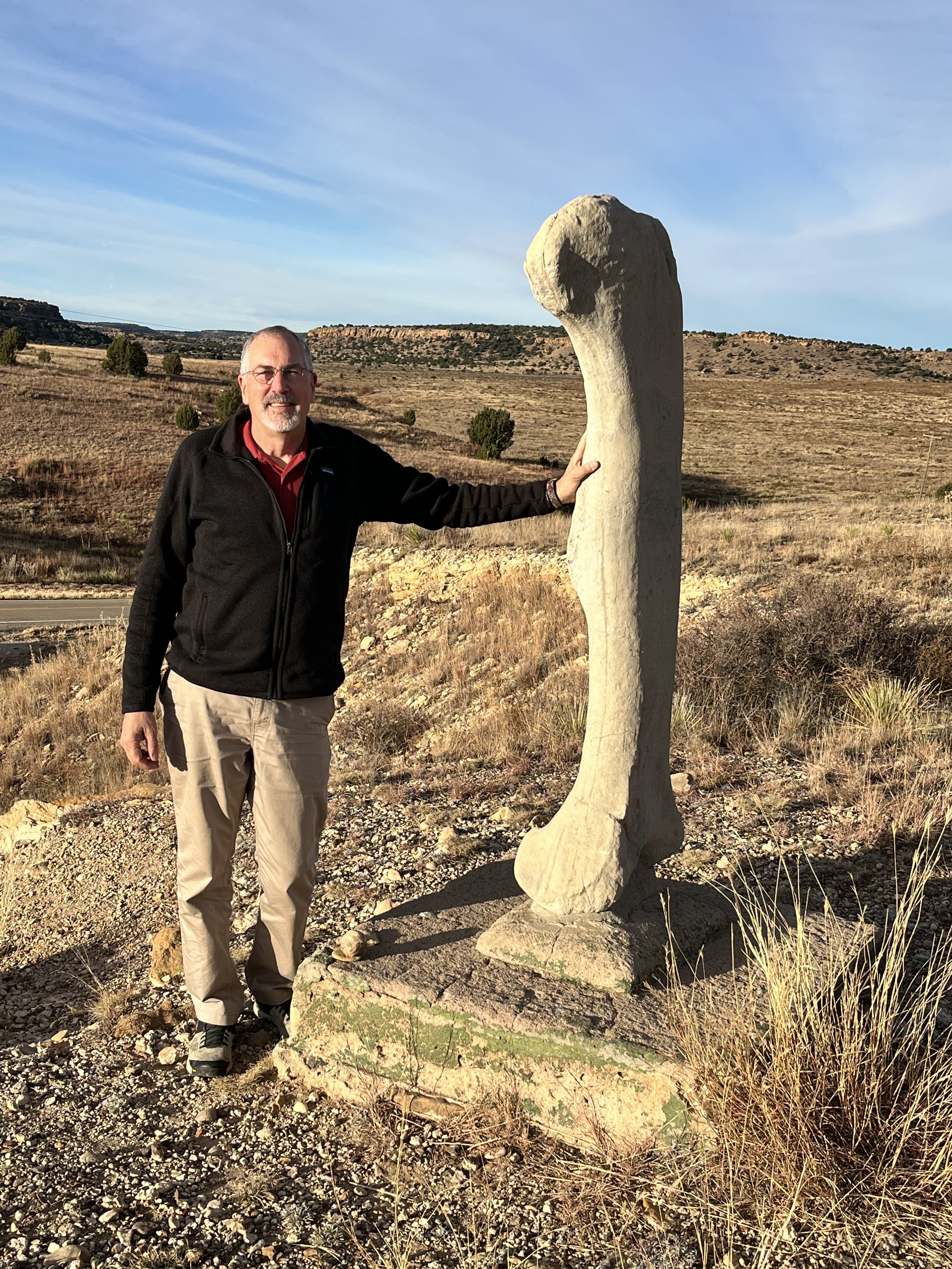 We departed west from Boise City on State Highway 325. Boise City, along with Clayton, New Mexico, are the only places where it’s possible to find gas, so we filled our car before leaving. A few kilometers after the road turned north we passed a monument marking the Cimarron (northern) cutoff of the Old Santa Fe Trail that was used in the 1820s. Nearby is a road leading west to Black Mesa State Park. We stopped briefly near a low ridge by the road to photograph the replica of a brontosaurus femur that is strangely mounted on a concrete pad without explanation. We turned north again on Black Mesa Road before reaching the town of Kenton. Kenton is the only Oklahoma community that recognizes Mountain instead of Central Time. The road makes a gentle curve around the western side of Black Mesa. Rounding a blend, we surprised a male bighorn sheep accompanied by two ewes near a driveway leading to the Mesa Valley Guesthouse.
