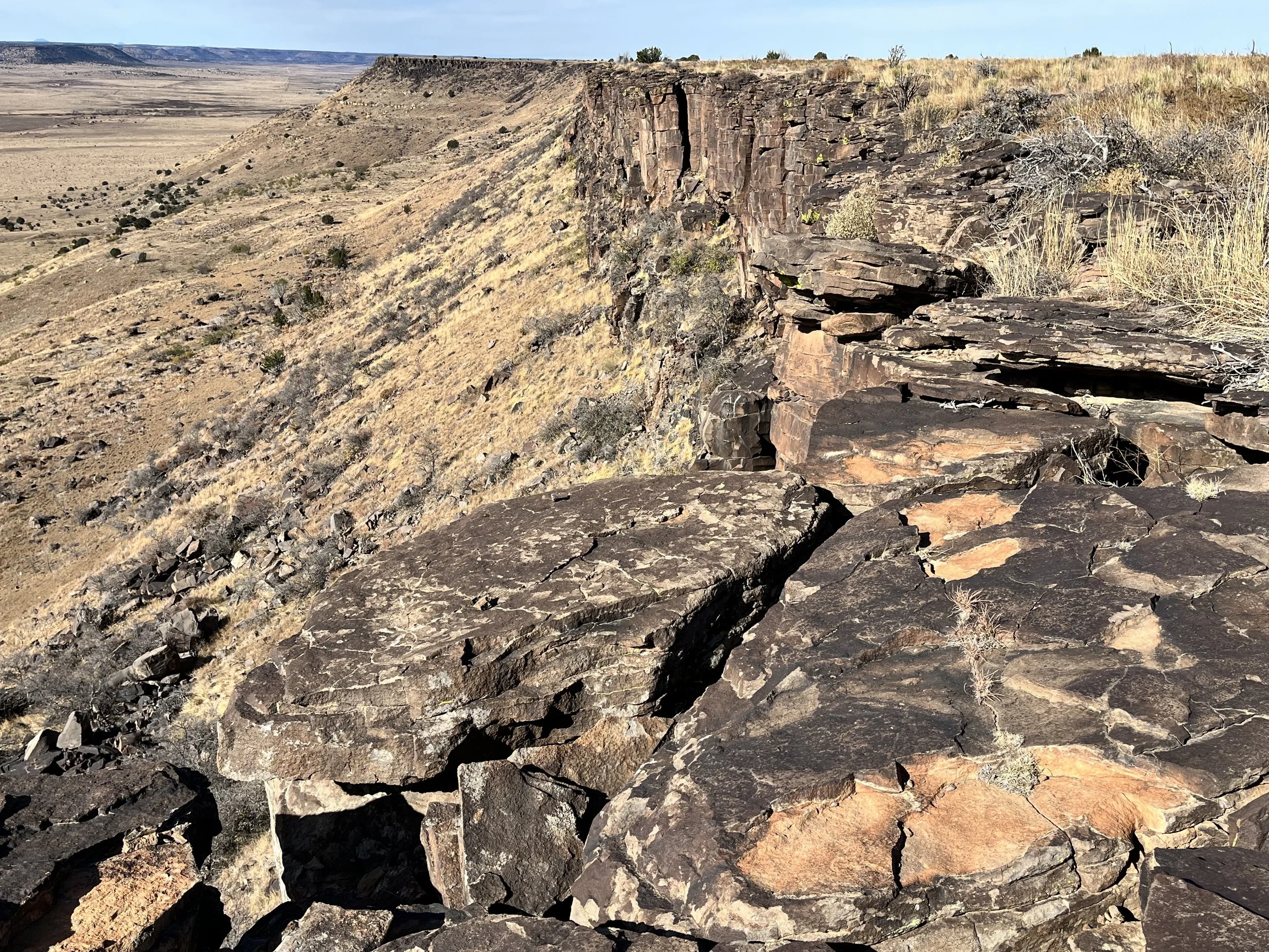 Extending forty-five kilometers in a southeastern direction from Colorado, Black Mesa is within a transition zone between the Rocky Mountains to the west and the Southern High Plains to the north, east, and south. The mesa terminates at a 61-meter-high escarpment near the Oklahoma town of Kenton. Geologically, Black Mesa is considered an “inverted valley” formed by the erosion of softer sedimentary rock that wasn’t covered by more resistant Raton basalt that emerged from a volcanic vent 3-5 million years ago. The same eruption created the Raton-Clayton volcanic field that presently covers parts of southeastern Colorado and northeastern New Mexico. The cap of volcanic rock forming the mesa is 180 meters thick and 89 kilometers long and covers older sedimentary rocks including Cretaceous period Dakota sandstone and Morrison formation rocks formed during the Jurassic period. Jurassic fossils have been discovered near the mesa including the bones of Camptosaurus, Stegosaurs, and Edmontosaurus. In 1931, road workers clearing a path through Kenton unearthed a 1.5-meter dinosaur rib belonging to an Apatosaurs. University of Oklahoma geologist J. Willis Stovall was sent to investigate and between 1935 and 1942, crews unearthed 30,000 fossil specimens.