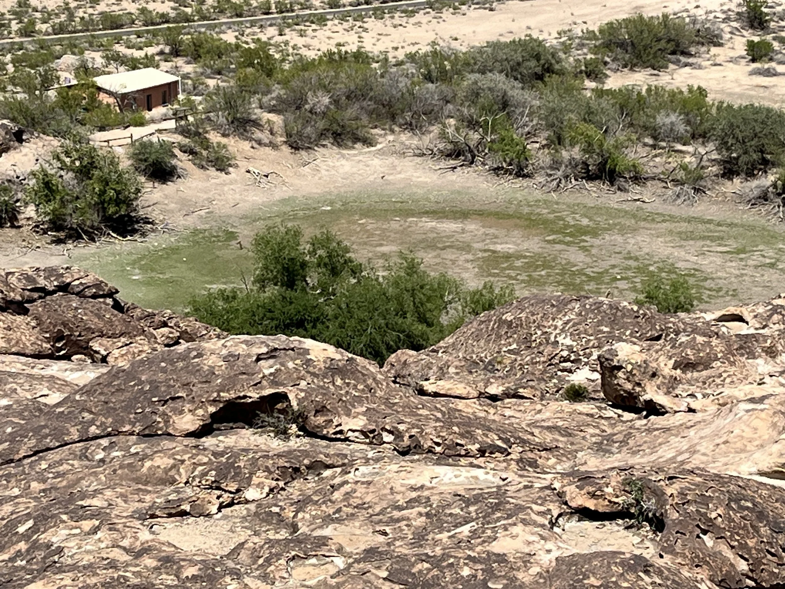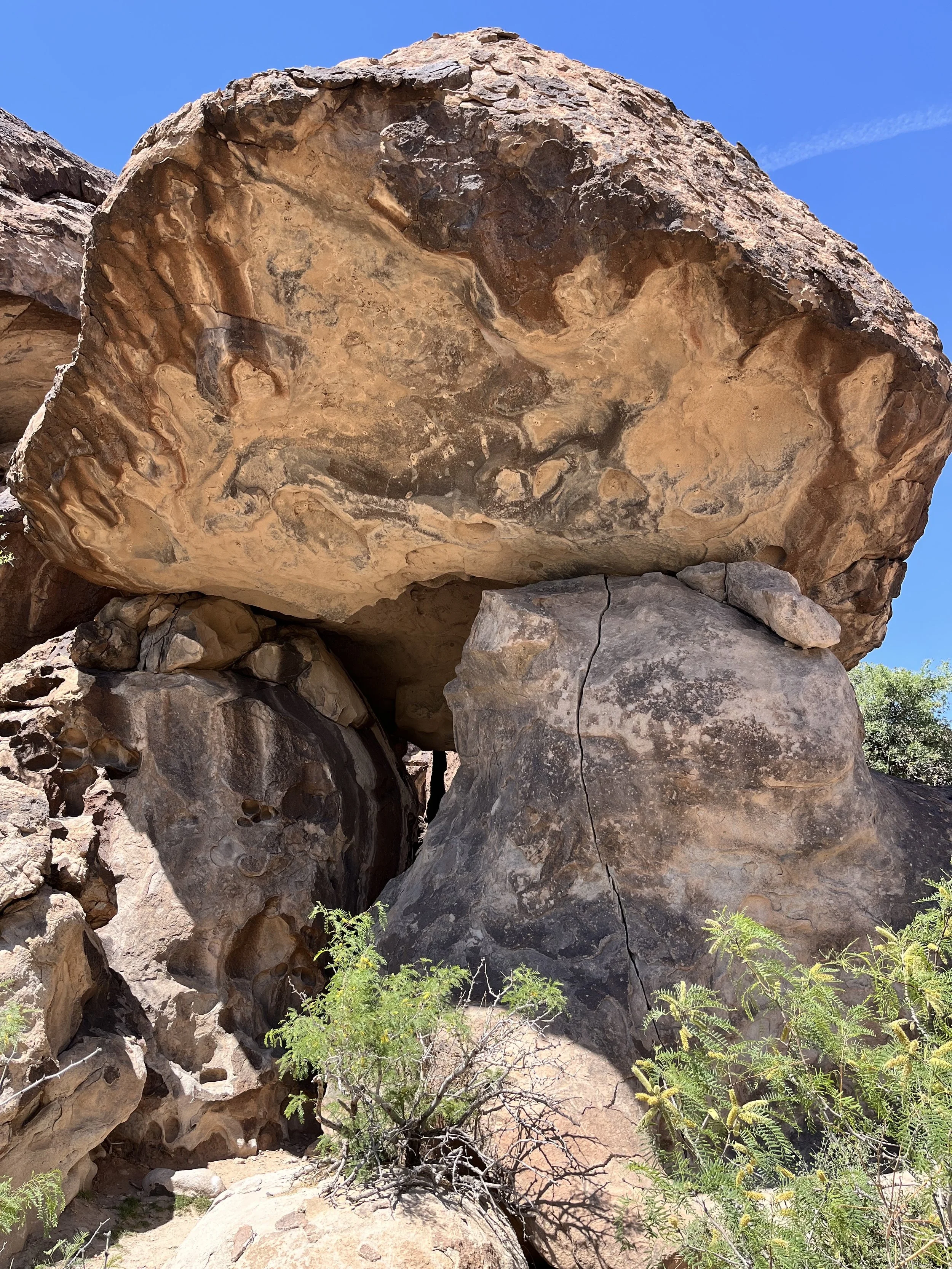 Covering an area of 348 hectares, Hueco Tanks State Park was established in 1970. Geographically speaking, the park is within the southern Basin and Range physiographic province and close to the westernmost point in Texas. The Hueco Mountains and to the west and the Franklin Mountains to the east. The park’s low hills were created 35 million years ago when magma pushed a layer of limestone upwards. The magma cooled and over millions of years erosion removed section of limestone, exposing hard igneous rock. The arid climate of West Texas means that surface water is precious. The larger area around Hueco Tanks receives less than 35 centimeters of precipitation each year with half falling in July, August, September, and October. The water-holding capacity of the Tank’s volcanic rock is bolstered by holes and cracks in the porous rock. In some places surface water held in rocky holes is shaded from the sun. The park’s diverse fauna ranges from javelina to coyotes, bobcats, badgers, racoons, salamanders, and rattlesnakes. Plants include creosote bushes, cottonwood and juniper trees, and prickly pear cactus. Generally speaking, the park’s plants and animals are more typical of those found at higher elevations.