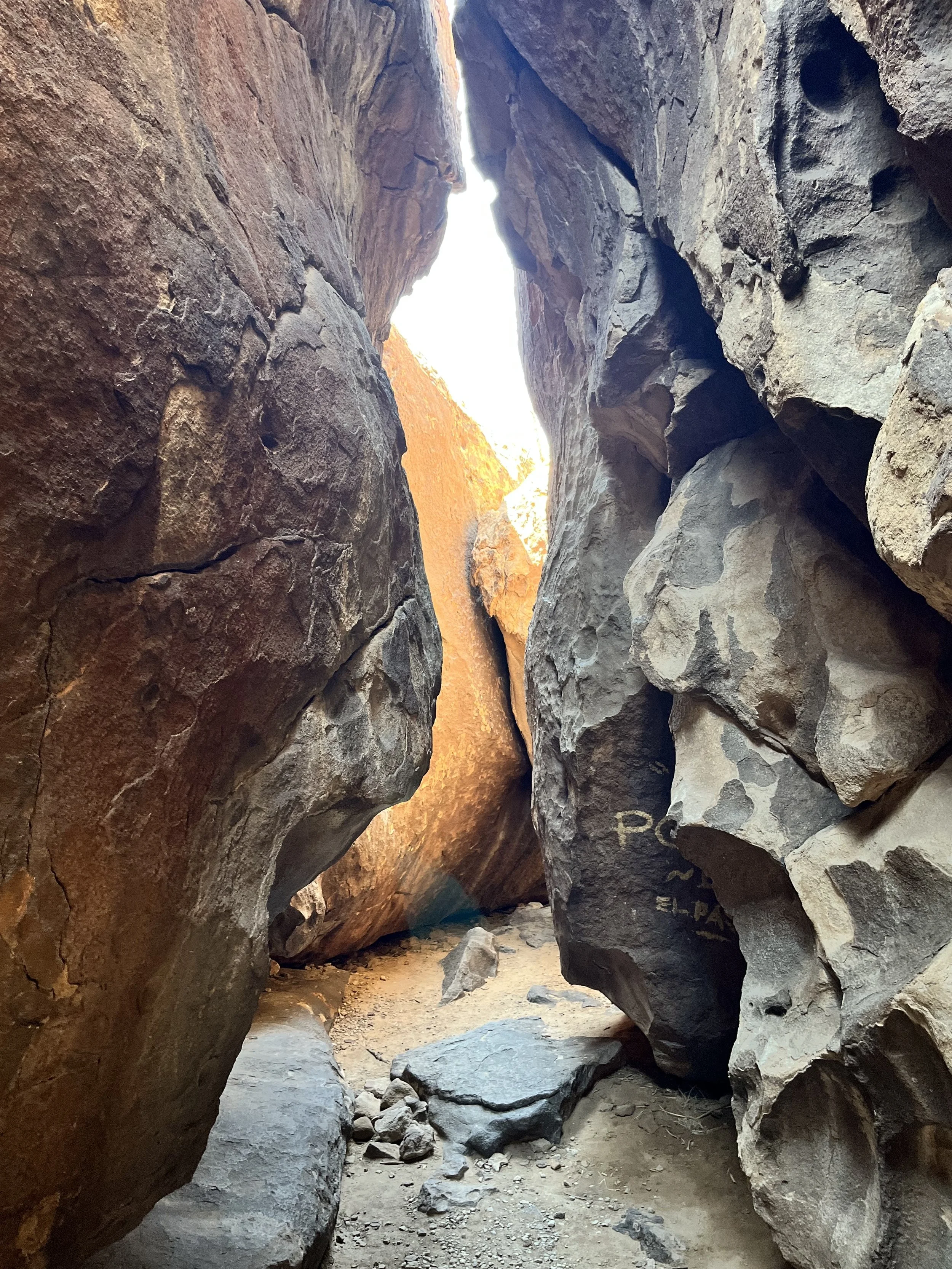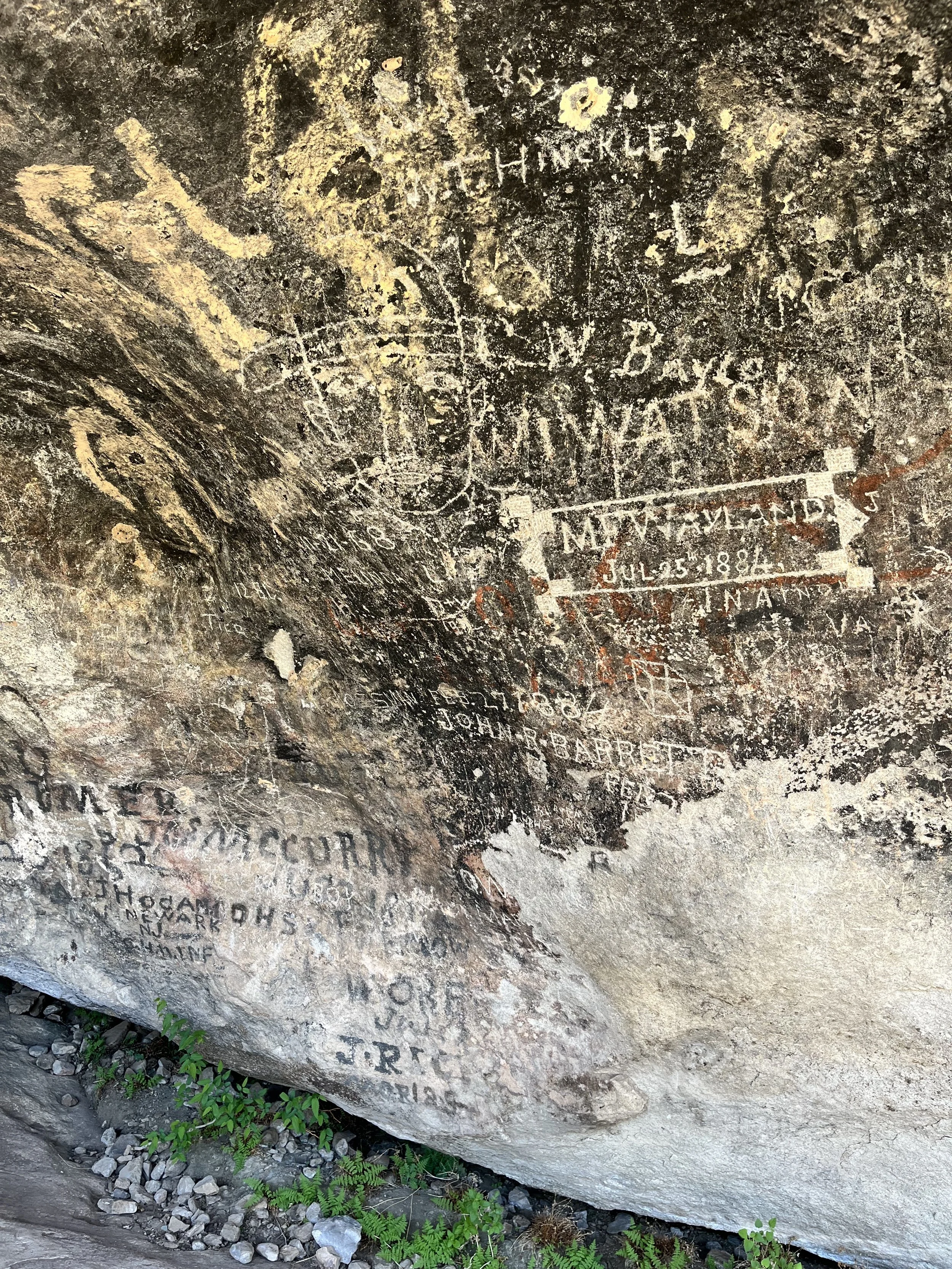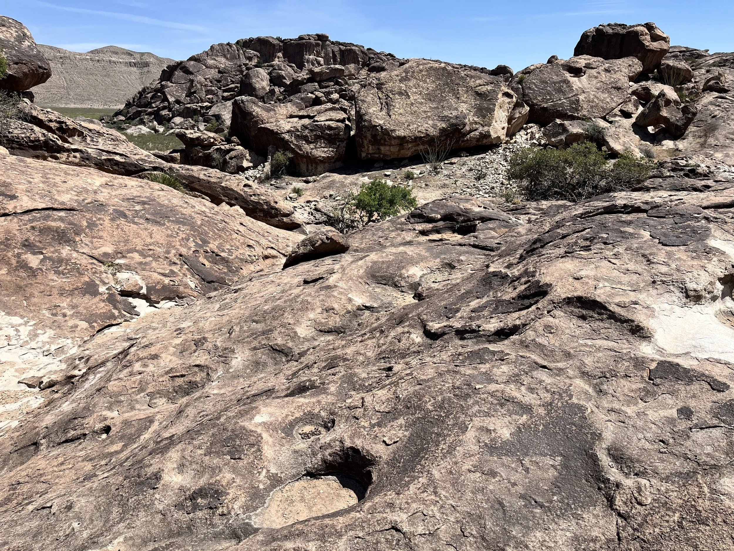 My companion and I stopped at the park’s visitor center. Hueco Tanks State Park is divided into four regions: East Spur, West Mountain, East Mountain, and North Mountain. Visitors wishing to hike are required to participate in a ranger-led orientation focused on the preservation of fragile natural and cultural resources. About two-thirds of the park is off limits to persons without a guide and tours must be booked well in advance. After completing our orientation session, we decided to hike two trails, both located on the park’s north side. The 1.0-kilometer (roundtrip) Site 17 Trail offered the chance to see petroglyphs. The park has more than 3,000 rock images including a collection found under a ledge called “Umbrella Shelter.” The most impressive single site on the trail is “Newspaper Rock” which has more than a hundred inscriptions dating from 1849 to the 1940s. Successive visitors left their names on Newspaper Rock including stagecoach passengers, Buffalo Soldiers, Texas Rangers, and homesteaders.