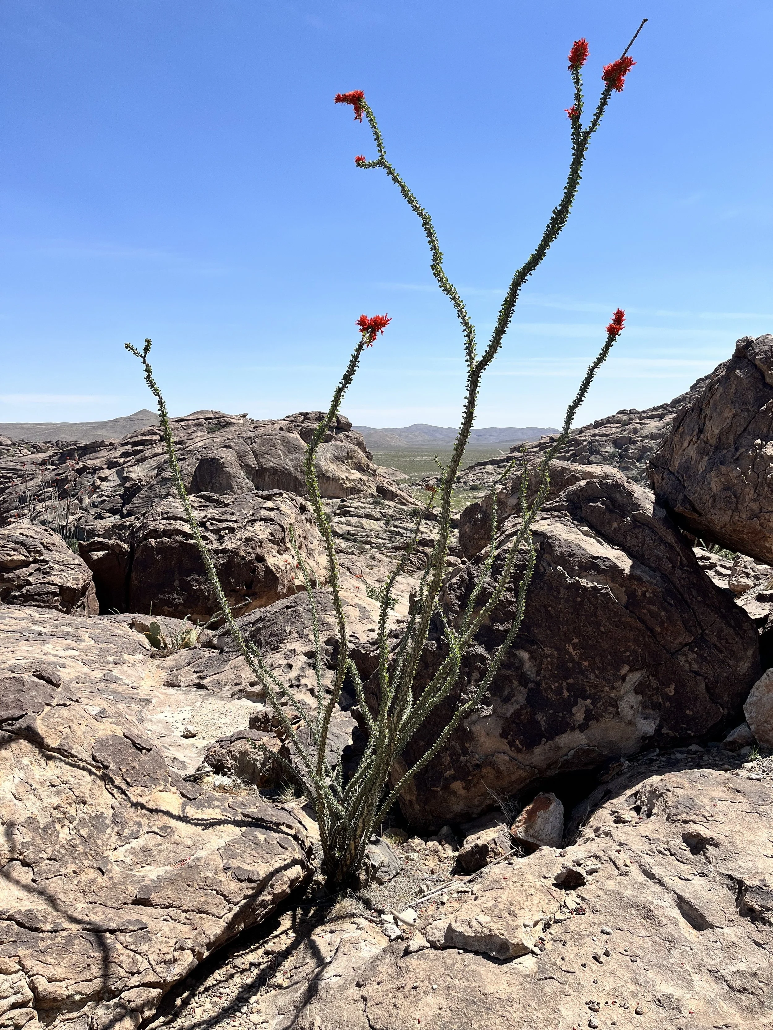 I stopped near the summit to take photos of an ocotillo in full bloom. Ocotillos are a large shrub with long unbranched stems that rise from a small trunk. The stems have short (less than 5cm) leaves that grow during periods of sufficient rainfall and fall off to conserve water during drier periods. In wetter months Ocotillo may have red-orange flowers at the tips of each stem. Ocotillo roots and stems are used by native peoples for healing ailments or making tea.
