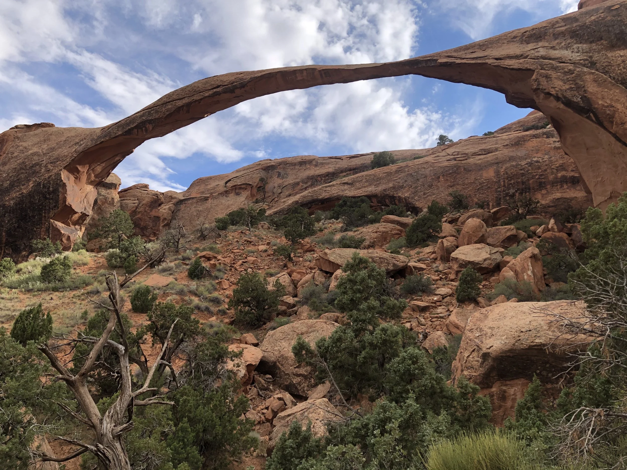 The larger region which includes Arches National Park has been occupied by humans for more than 10,000 years. Indigenous peoples who hunted and camped in and around the present-day park include groups of Navajo, Paiute, Sioux, Zuni, and Southern Ute. Spanish missionaries passed through the area and later farmers, ranchers, and miners. John “Doc” Williams was an early proponent of protecting the area’s balanced rocks, rock fins, pinnacles, and arches. Another was Loren “Bush” Taylor, editor of a Moab newspaper who wrote about marvels of the area’s rocky wonderland. My companion and I drove a few kilometers into the northern section of Arches, leaving our car at a parking lot near Devil’s Garden Trailhead. Traveling on foot, we followed the 2.9 km (roundtrip) trail to Landscape Arch, the world’s fifth longest arch at 88.4 meters.