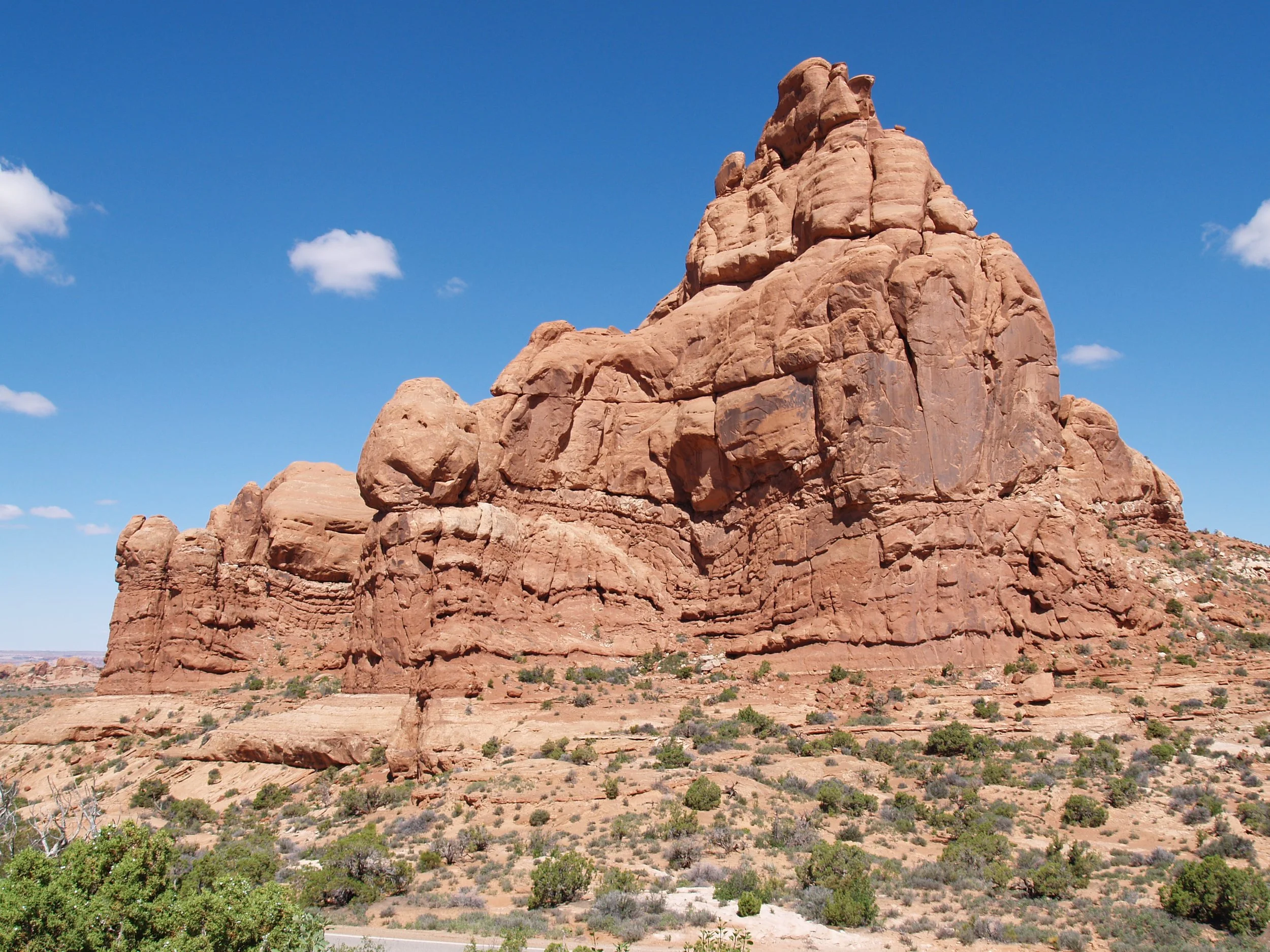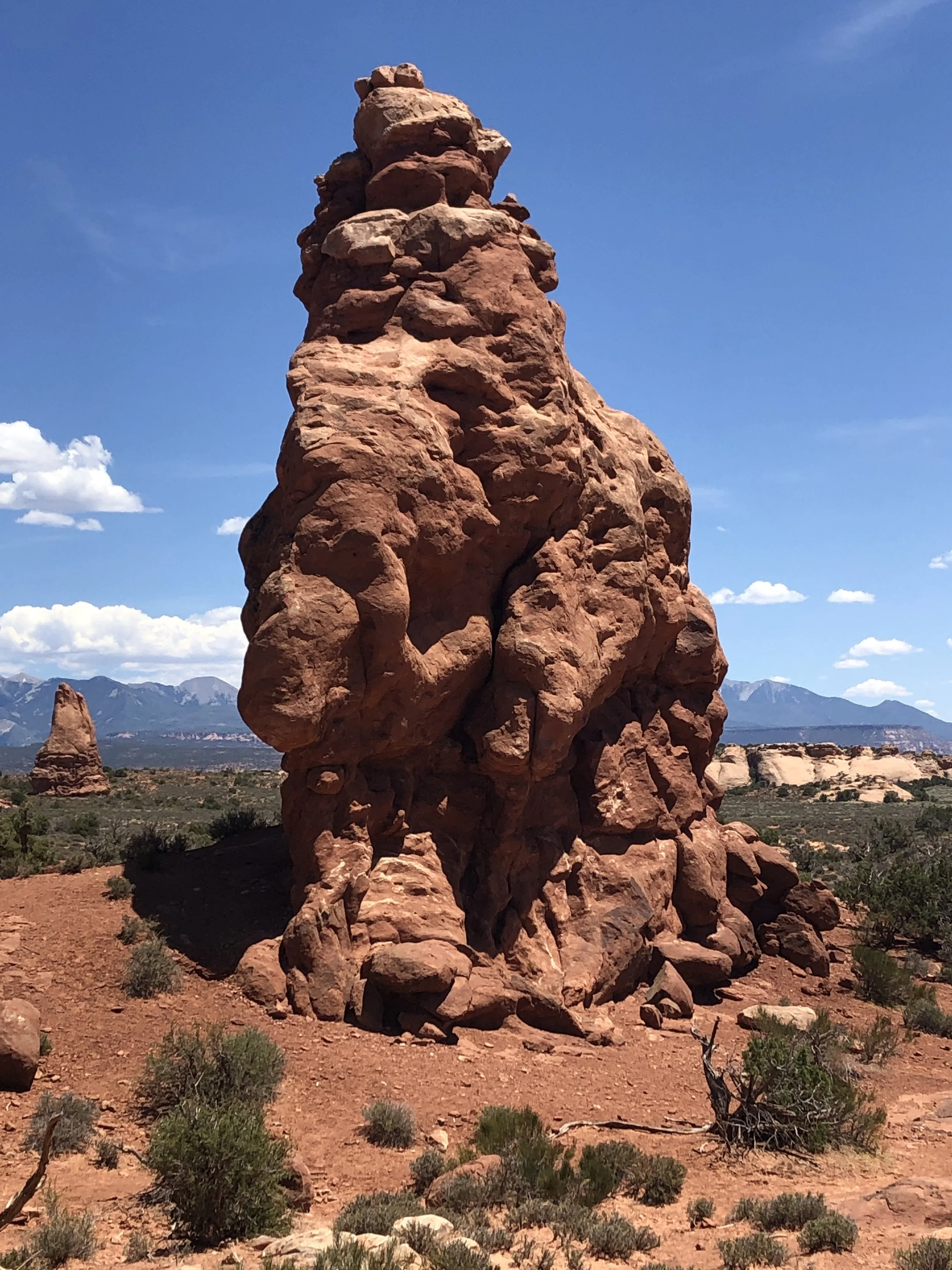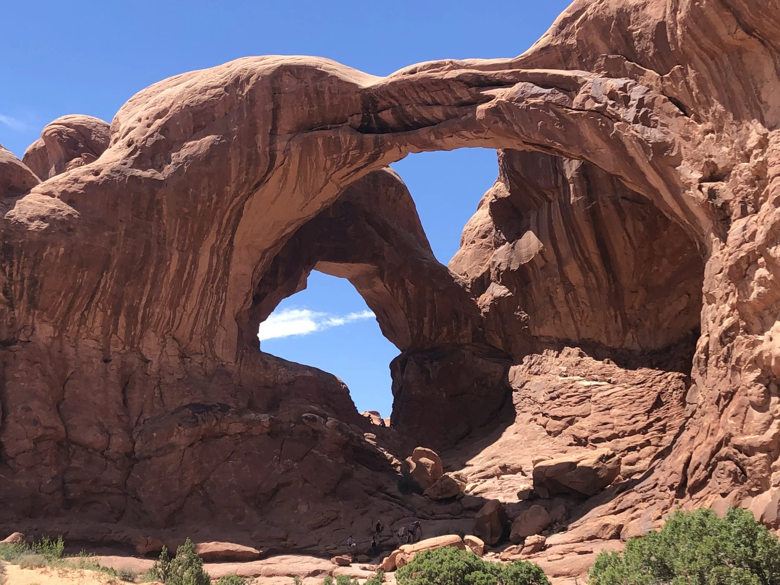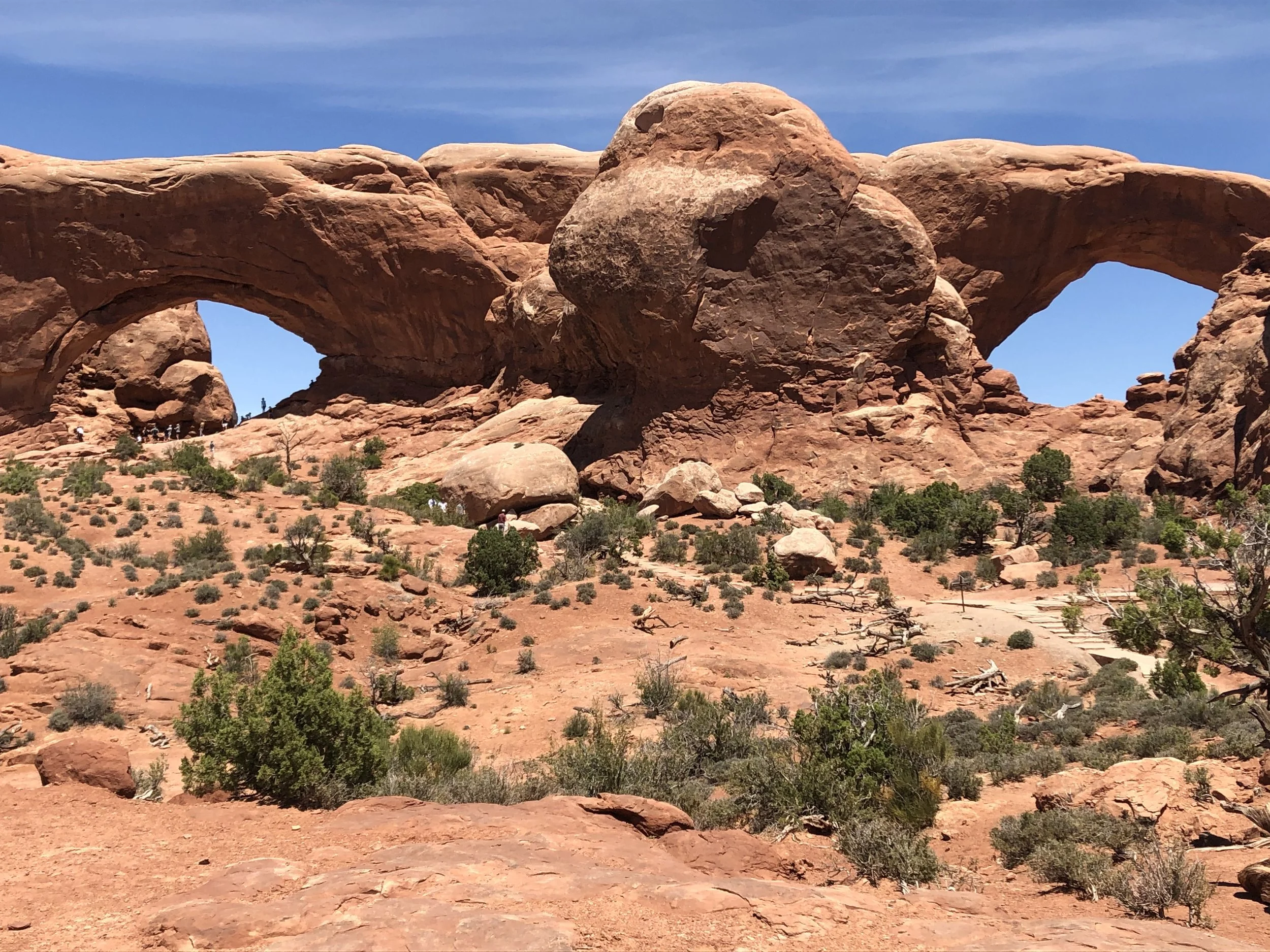 Another road took us to the parking area adjacent to Double Arch (aka “The Spectacles”). Located in the park’s Windows section and at the end of a circle drive, the trail also provides access to Elephant Butte, Ribbon Arch, and Cove Arch. Double Arch is considered a pothole arch, meaning that it was created by erosion from above rather than from the side. Cut from the same sandstone fin, its two arches share a foundation. Oddly, Double Arch doesn’t seem especially large when viewed from the parking lot. However, the largest of its two openings is 45 meters long and 32 meters high. The arch may be recognizable as a backdrop for the 1989 movie, Indiana Jones and the Last Crusade.