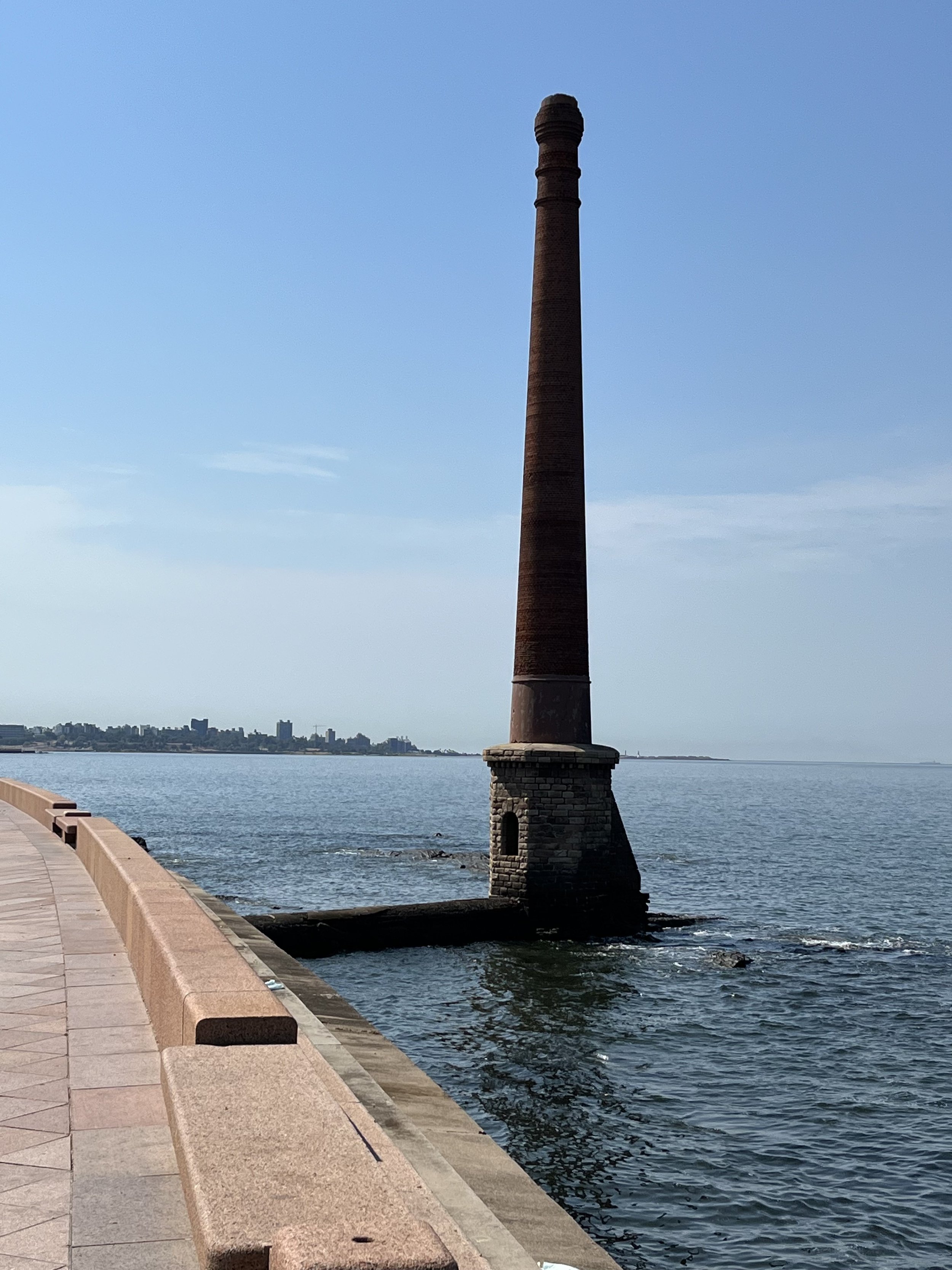 We had to make special arrangements to bring our Argentinian rental car on the ferry from Buenos Aires. After making the crossing we disembarked at the ferry terminal in Colonia del Sacramento. After a brief walking tour of Colonia del Sacramento, we drove southeast to Montevideo and checked into our hotel located on Rambla Francia (aka Rambla Gran Bretaña). We were fortunate that our room faced the estuary. After settling in, we set out on foot to explore the city, beginning with a walk along the malecón (or esplanade) that ran parallel to Rambla Francia. Lying a few meters from the seawall was an odd sight — a solitary brick smokestack. We speculated that it belonged to a long-forgotten factory. Our walking tour continued to a fishing pier known as Escollera Sarandí, and then to the harbor.